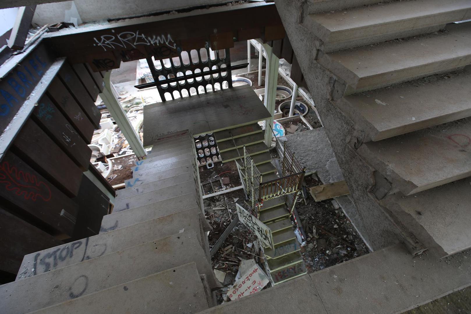 U njemu je porazbijano, slomljeno i iščupano sve što se dalo. Većine namještaja odavno nema, na prozorima su samo krhotine stakla, preostale fotelje i kaučevi su iščupani, vrata su razvaljena, zidovi i stropovi oljušteni, a svi podovi pokriveni su ostacima drva, stakla i pločica
