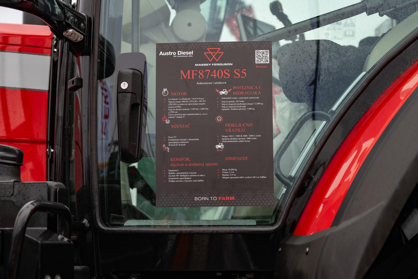 Riječ je o traktoru Massey Ferguson MF 8740S S5 iz serije MF 8700 S koji je pravi div s AGCO Power motorom od 8,4 litara i snagom do 400 KS s EPM-om. S najvećim okretnim momentom od oko 1.600 Nm, ovaj traktor bez muke vuče najteže terete.