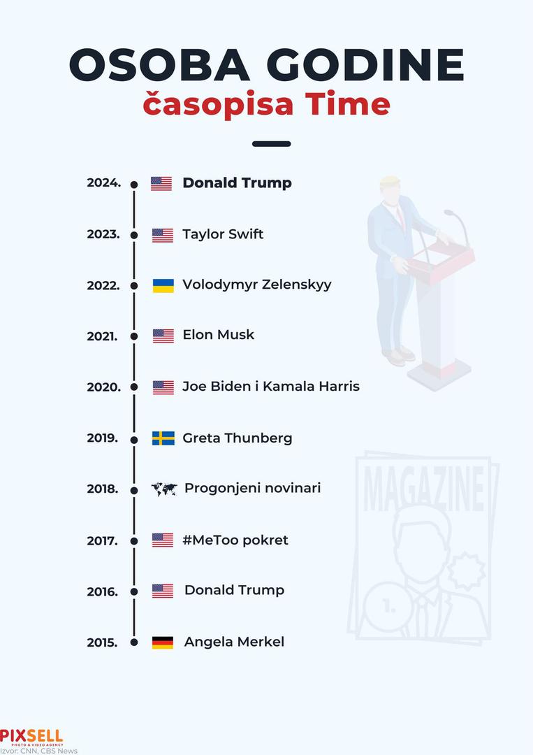 Donald Trump, novoizabrani američki predsjednik, proglašen je osobom 2024. godine po izboru magazina "Time". On je, naime, osoba godine bio i 2016., kada je prvi put izabran za američkog predsjednika. U nastavku donosimo tko je sve bio izabran od 2015. godine.