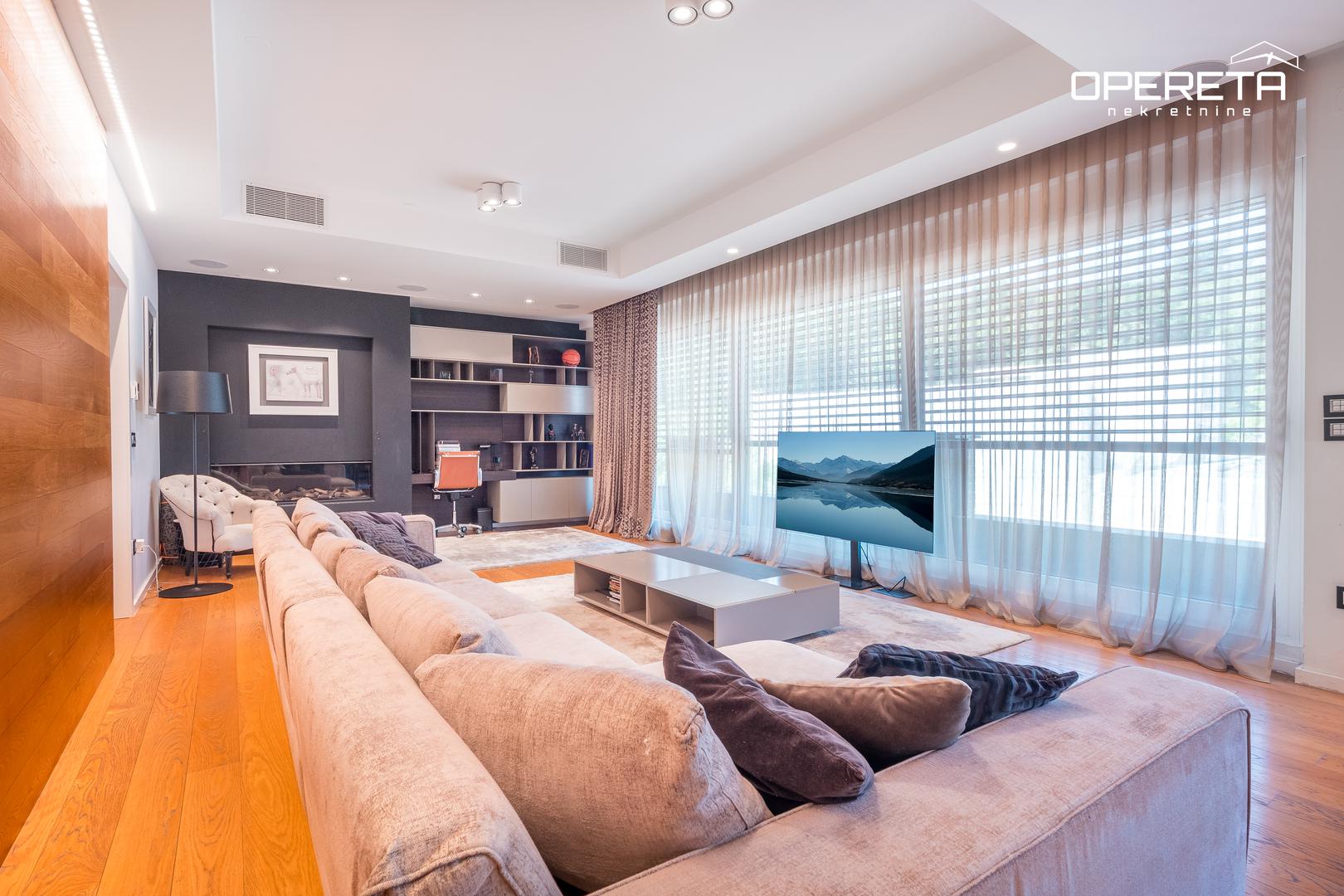 Zapadna orijentacija donosi obilje prirodnog svjetla, a prostrani open space dnevni boravak povezan s kuhinjom i blagovaonicom stvara dojam elegancije i prozračnosti. Kamin dodatno naglašava toplinu prostora, dok velika staklena stijena pruža otvoren pogled i poseban ugođaj tijekom cijele godine.
