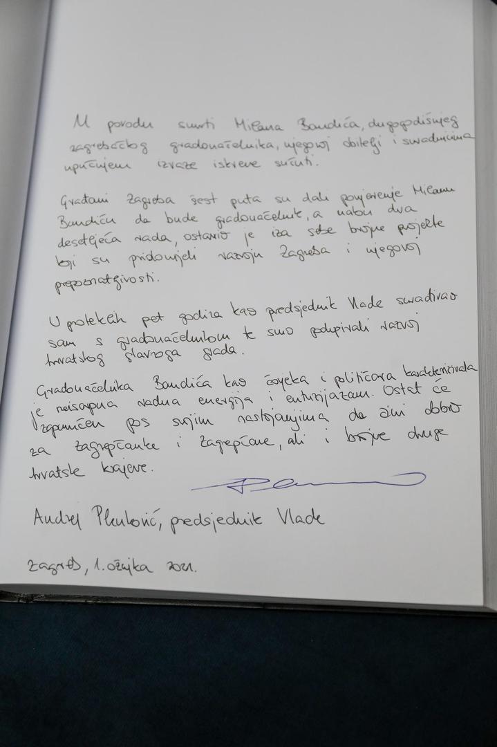 "Danas smo ovdje kako bismo se kao Vlada upisali u knjigu žalosti u povodu smrti Milana Bandića. Bio je na ovoj funkciji dva desetljeća. Doprinosio je razvoju grada, imao je veliku životnu energiju i entuzijazam i radio je za grad. Njegov odlazak bio je nagao i želim mu zahvaliti na svemu onome što je dobro učinio za Zagreb, Zagrepčanke, Zagrepčane i druge krajeve Hrvatske", kazao je Plenković novinarima.