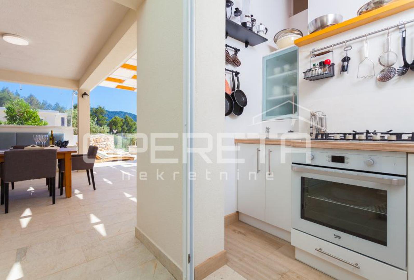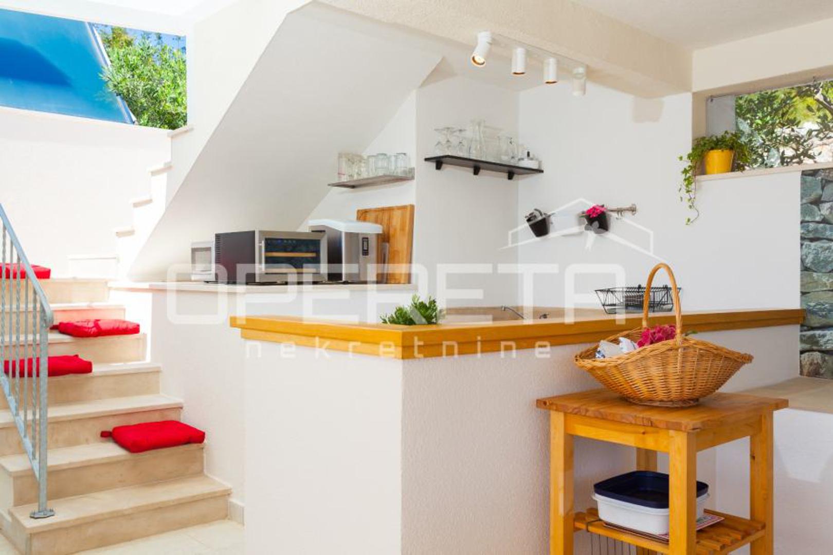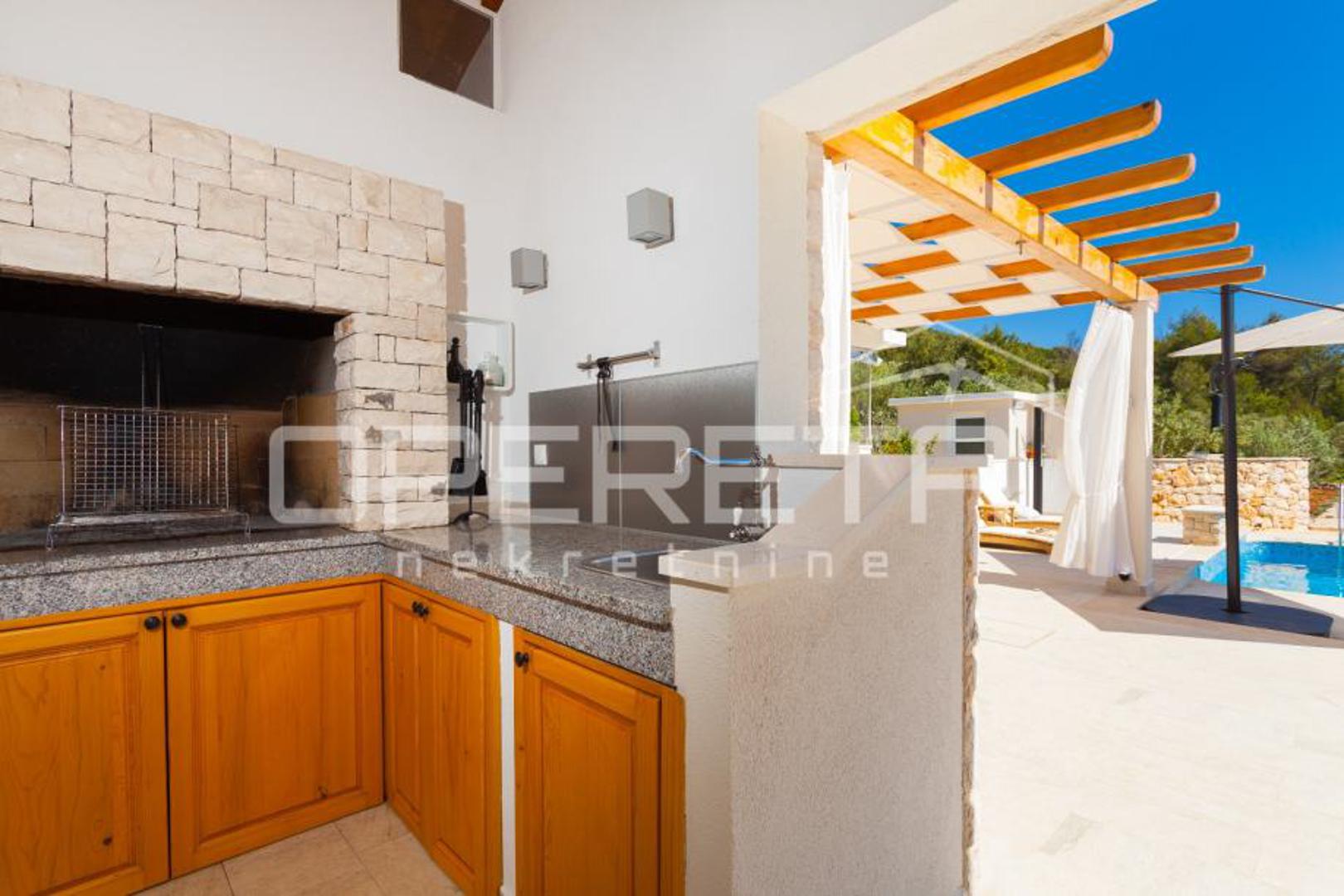 Uz elegantno uređene unutarnje prostore, kuća nudi i bogat vanjski sadržaj. Tu su terasa i lođa, vanjska kuhinja s roštiljem i šankom, grijani bazen sa sunčalištem, sauna te dodatni prostor za obiteljski odmor i zabavu, uključujući dječju zonu s trampolinom, pješčanikom i stolnim tenisom.