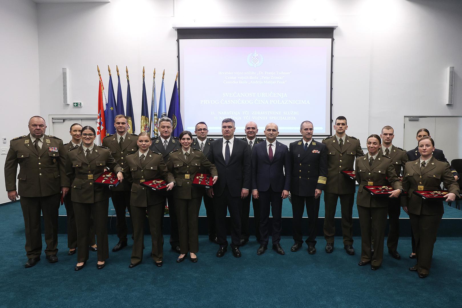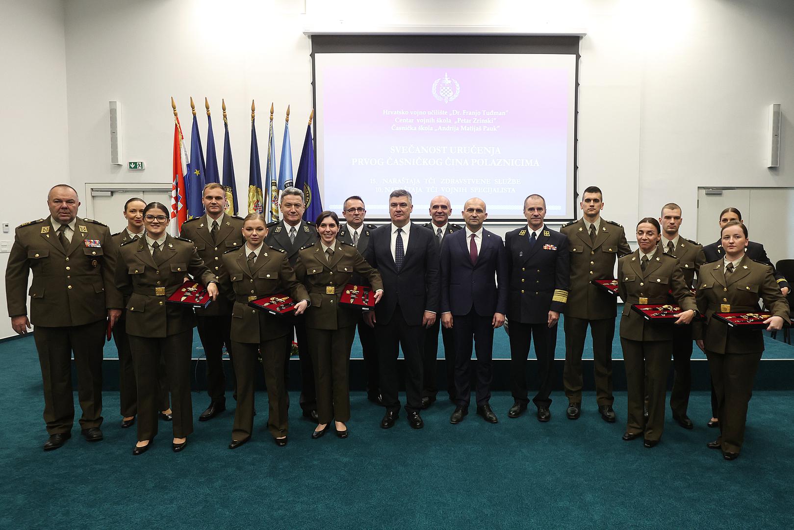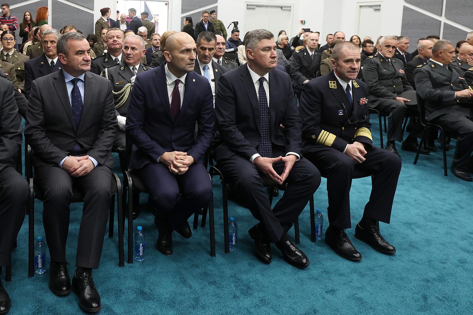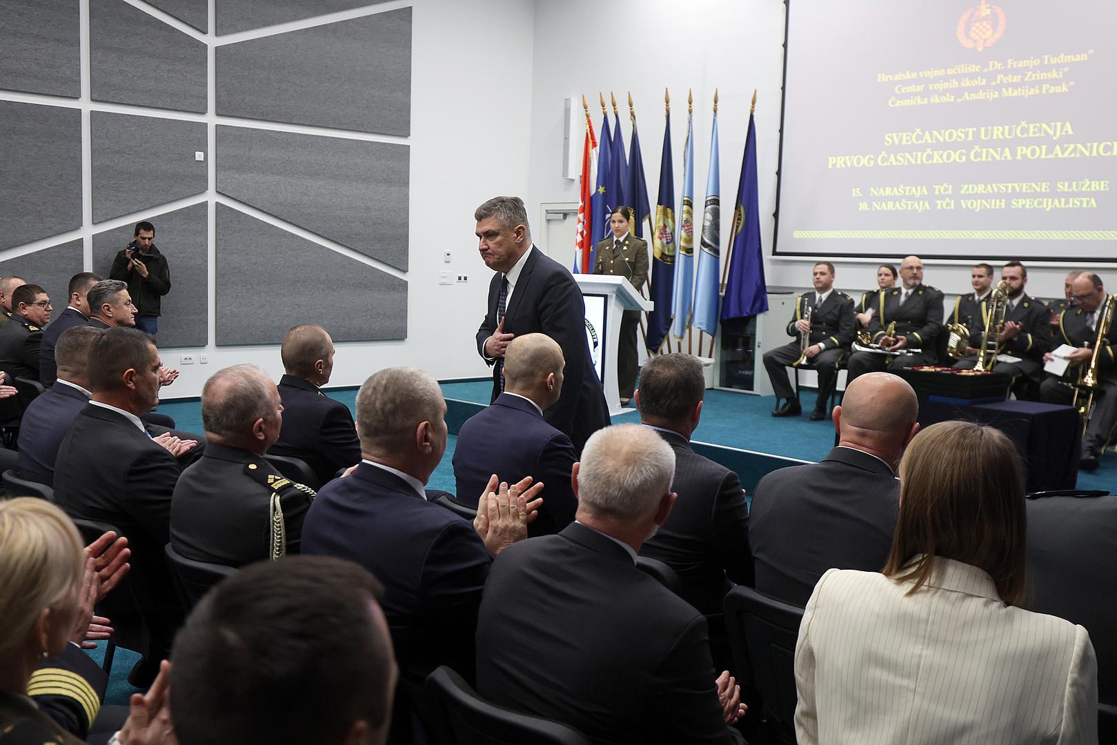 'Želim svu sreću, znanje i umijeće hrvatskoj izvršnoj vlasti i ovdje prisutnom ministru u opremanju Hrvatske vojske, u završetku projekata u koje smo krenuli prije puno godina. To mislim prije svega na neke stvari vezane uz Hrvatsku ratnu mornaricu i Obalnu stražu, to će biti jako teško', izjavio je predsjednik Republike Zoran Milanović na Hrvatskom vojnom učilištu 'Dr. Franjo Tuđman' gdje je sudjelovao na promociji novih časnica i časnika Oružanih snaga Republike Hrvatske i dodjeli prvih časničkih činova zdravstvene službe.