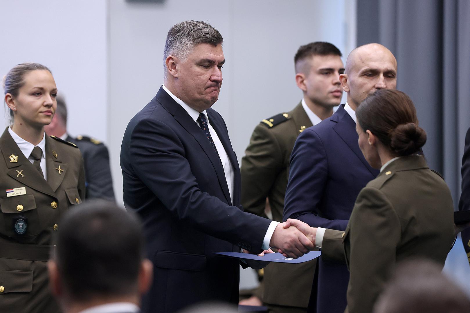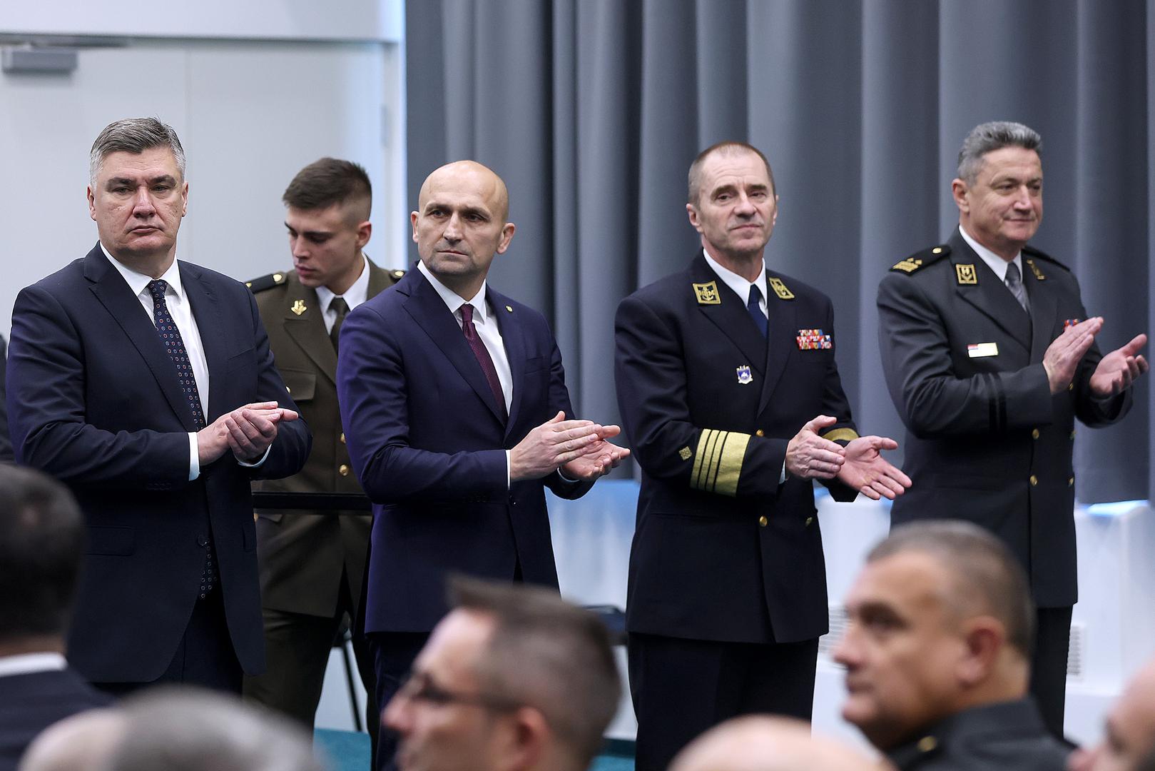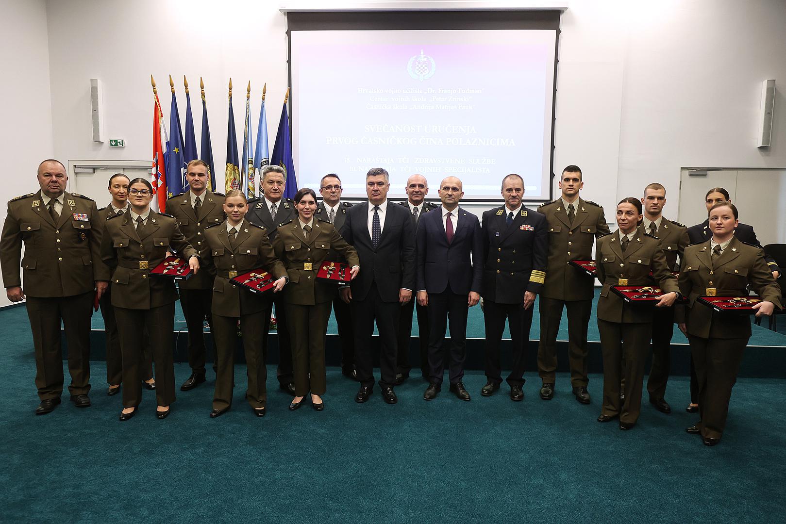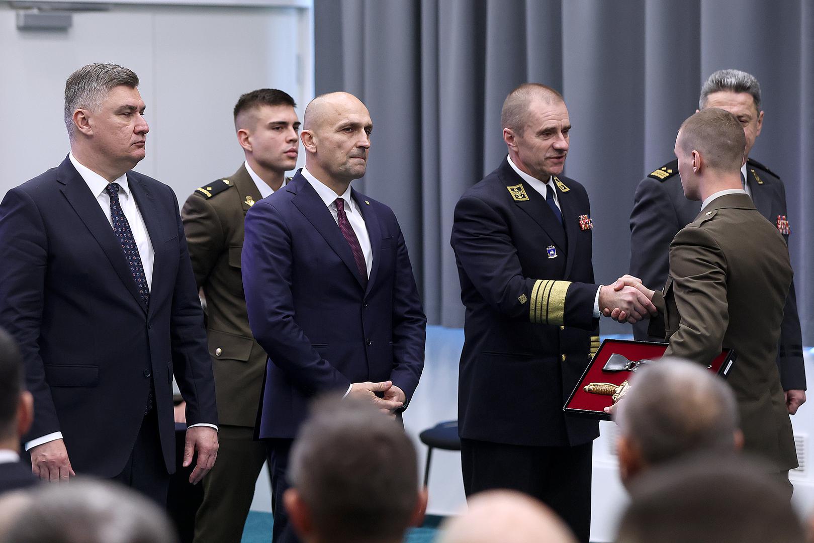 'Želim svu sreću, znanje i umijeće hrvatskoj izvršnoj vlasti i ovdje prisutnom ministru u opremanju Hrvatske vojske, u završetku projekata u koje smo krenuli prije puno godina. To mislim prije svega na neke stvari vezane uz Hrvatsku ratnu mornaricu i Obalnu stražu, to će biti jako teško', izjavio je predsjednik Republike Zoran Milanović na Hrvatskom vojnom učilištu 'Dr. Franjo Tuđman' gdje je sudjelovao na promociji novih časnica i časnika Oružanih snaga Republike Hrvatske i dodjeli prvih časničkih činova zdravstvene službe.