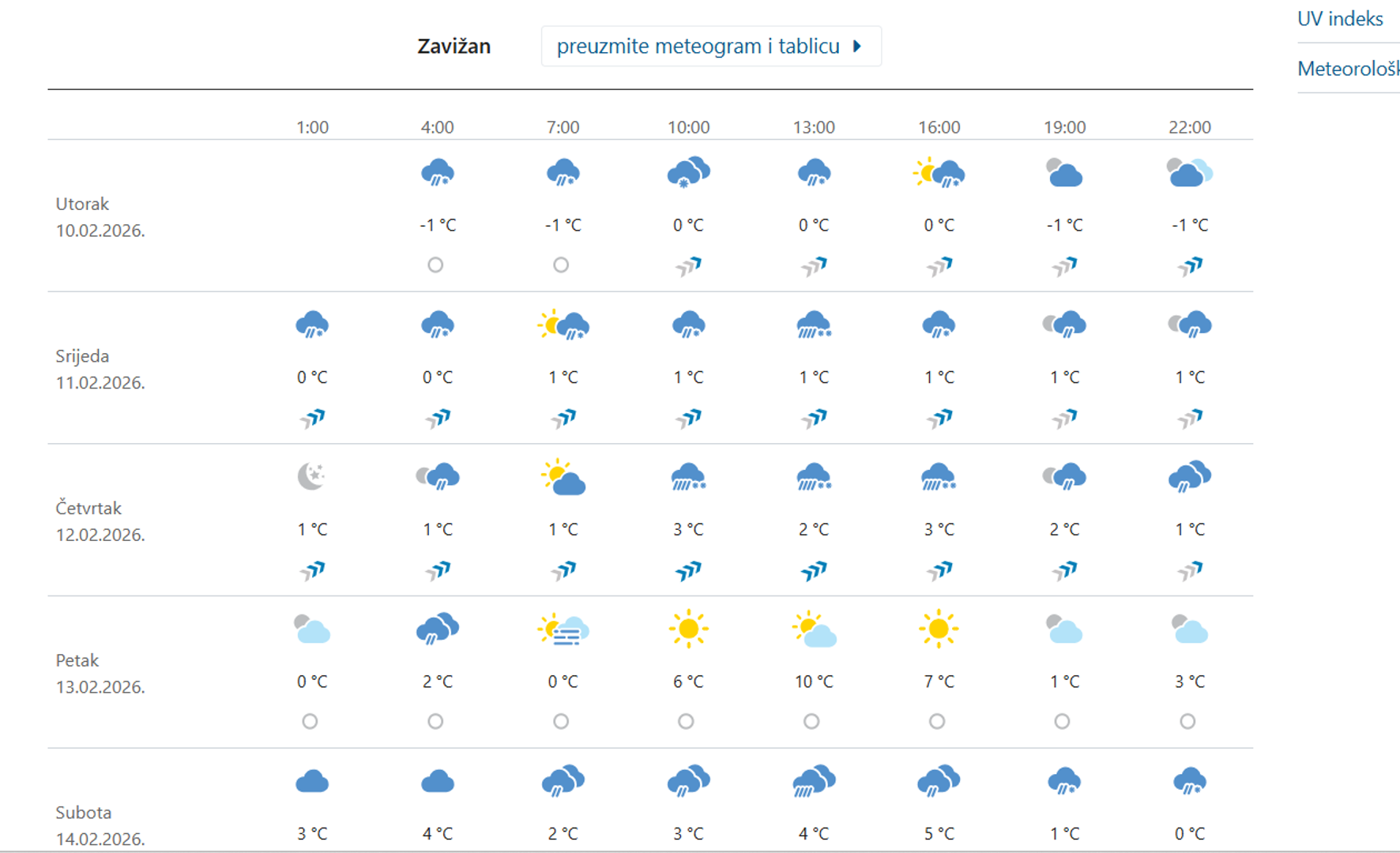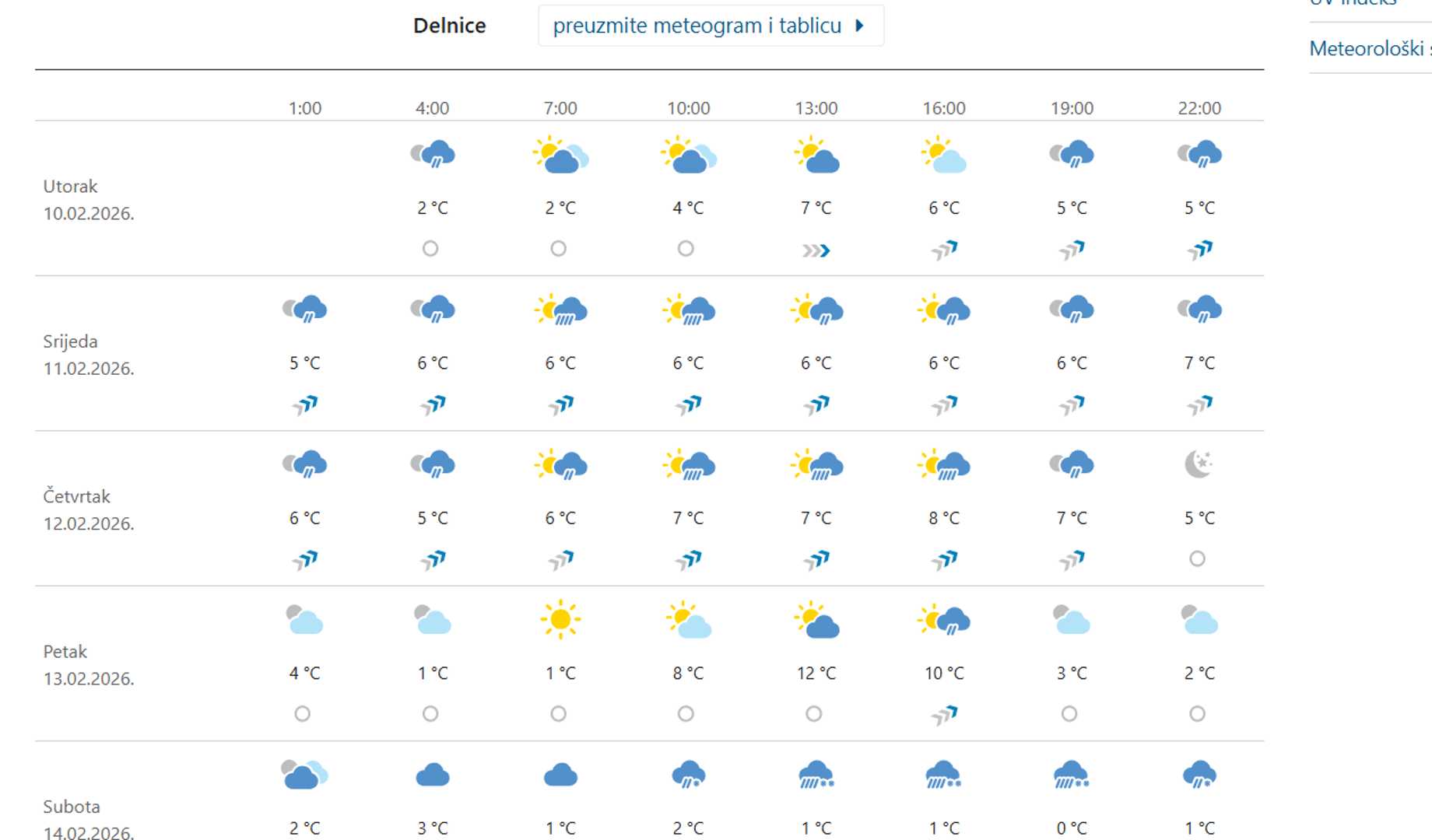 Utorak nam donosi umjereno do pretežno oblačno vrijeme, uz mjestimice rosulju i kišu, ponajviše na Jadranu i predjelima uz njega. Na kopnu ujutro ponegdje magla. Najviša temperatura od 5 do 9, a na obali i otocima između 10 i 14 °C. Srijeda nam donosi promjenljivo i pretežno oblačno mjestimice s kišom, osobito na Jadranu gdje može biti i pljuskova s grmljavinom. Najniža jutarnja temperatura zraka od 1 do 5, na Jadranu između 7 i 11, a najviša dnevna uglavnom od 10 do 15 °C, u gorju malo niža. Prema izgledima vremena DHMZ-a do petka će biti promjenljivo i pretežno oblačno, mjestimice s kišom, a na Jadranu i pljuskovima s grmljavinom. Puhat će povremeno umjeren jugozapadni vjetar, na Jadranu umjereno i jako, mjestimice i olujno jugo, u petak sjeverozapadni vjetar. Bit će iznadprosječno toplo.