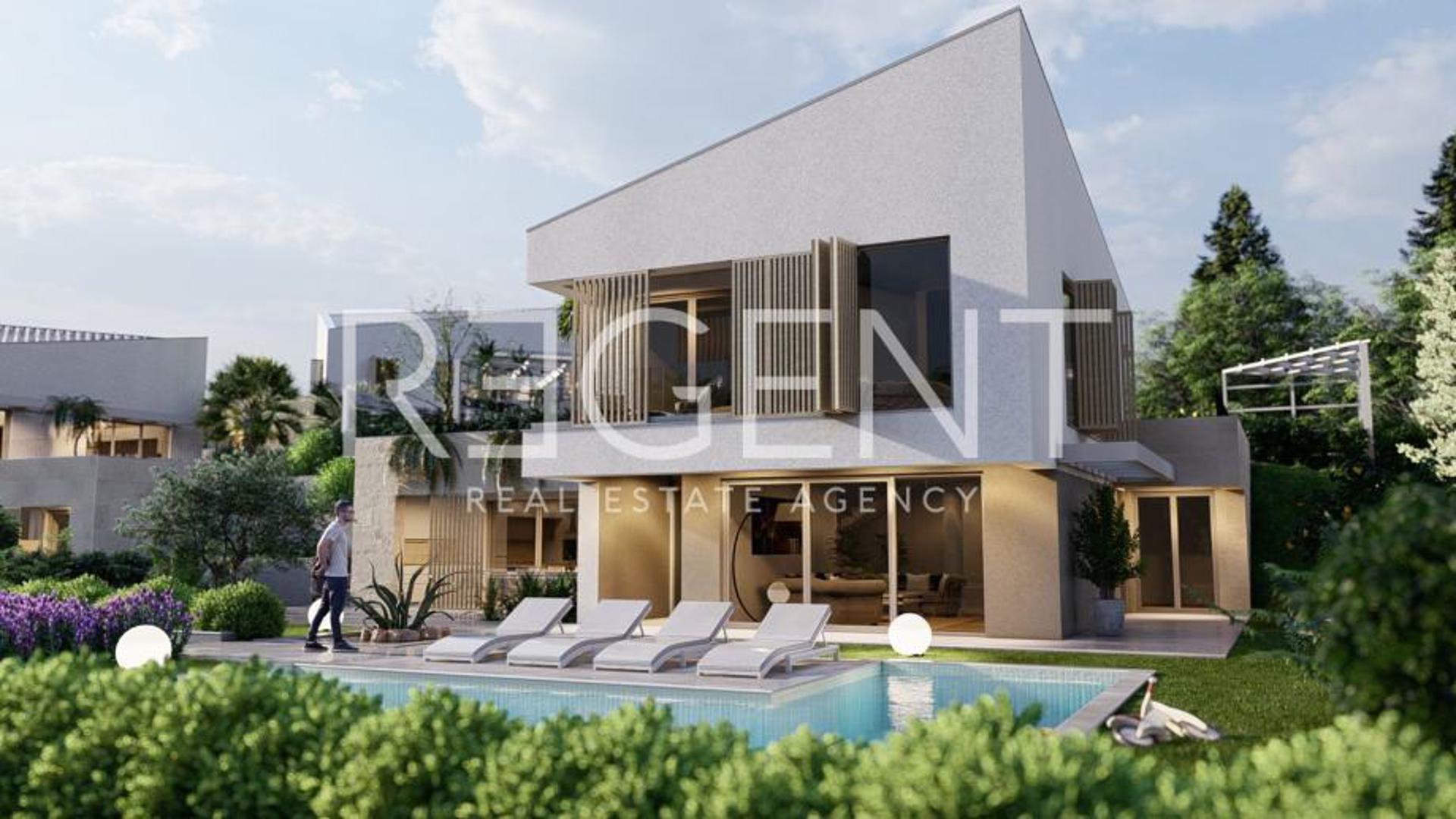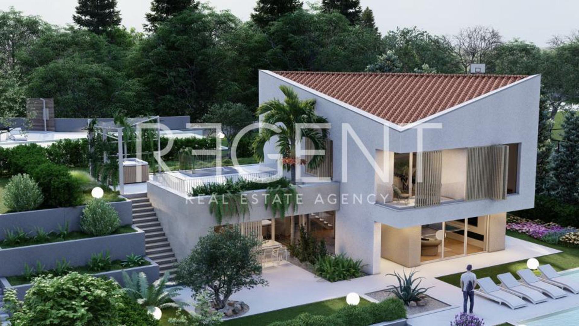 Okućnica uključuje bazen od 40 kvadrata, natkrivenu terasu s ljetnom kuhinjom, prostor za druženje i četiri vanjska parkirna mjesta. Vila je južno orijentirana i opremljena optičkim internetom, video nadzorom, alarmnim sustavom i klima uređajima.