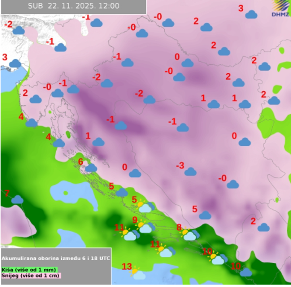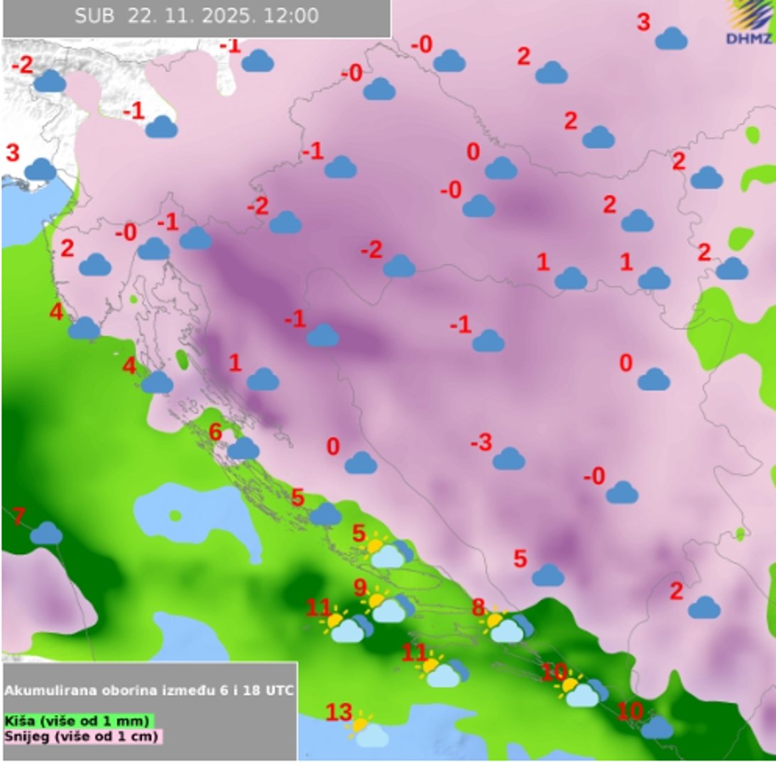 U petak će snijega biti i u nižim predjelima unutrašnjosti, izgledno je stvaranje makar tanjeg snježnog pokrivača. Duž Jadrana i uz Jadran lokalno može biti izraženijih pljuskova s grmljavinom. Zapuhat će umjerena do jaka bura, koja će se pojačavati prema večeri. Subota će također biti vjetrovita, dojam će biti pravi zimski. Na kopnu će padati snijeg, s tim da koja pahulja uz jaku i olujnu buru može stići i do same obale, piše i N1. Karta DHMZ-a pokazuje snijeg za cijelu zemlju. Bit će prava zimska idila.