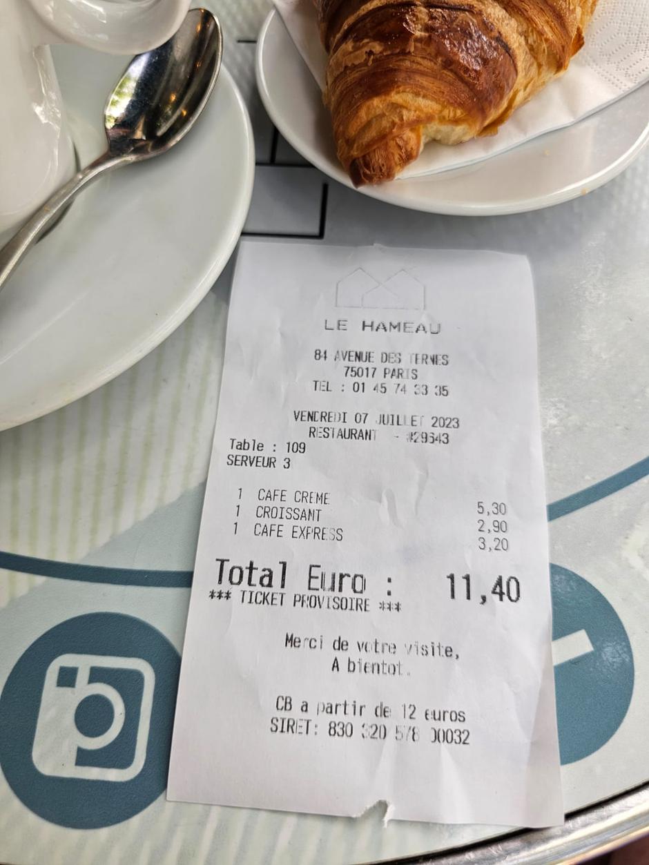 ''Cafe express'', kako je pisalo na računu, koštao je 3,20 eura, dok je cafe creme, jedna of francuskih verzija kave s mlijekom, koštala čak 5,30 eura. Kroasan je bio 2,90 eura. Dodaje i da je cappuccino u cjeniku bio izlistan po cijeni od 6,1 euro.