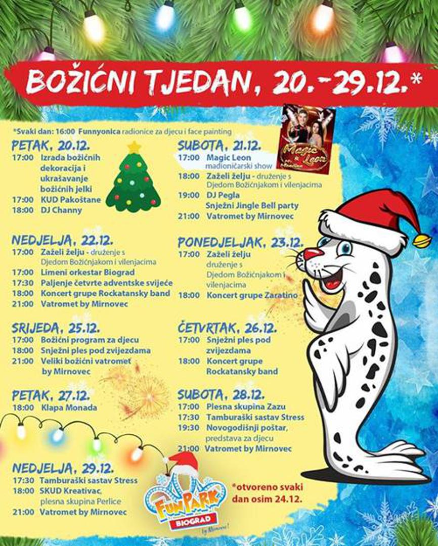 Božićna bajka Fun parka Biograd ulazi u sam vrhunac i donosi raznoliki adventski program. U bogatom adventskom zabavnom kalendaru od početka prosinca izmjenjivale su se predstave, performansi, animacije, koncerti, božićne radionice u Funnyonici, gdje su najmanji na zabavan način mogli i ponešto naučiti o Božiću, pravi snježni disko partiji, vožnje i vatrometi, a sve to u fantastičnoj dekoraciji Gospodara svjetla.