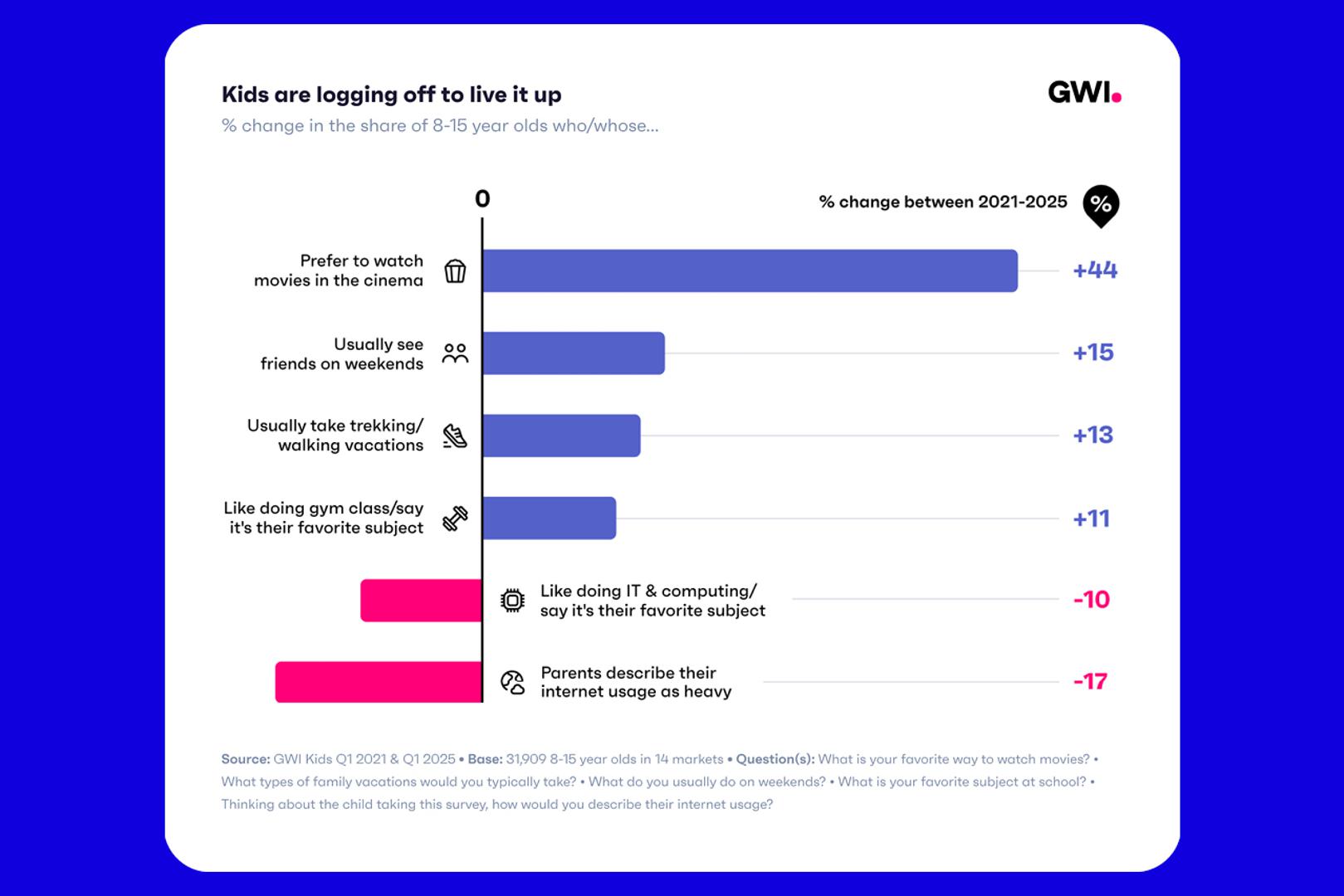 Jača potreba za fizičkim iskustvima vidi se i u drugim segmentima. GWI izvještaj ističe porast od čak 8 % djece koja često igraju društvene igre u razdoblju između 2021. i 2025. godine. Udio djece u dobi od 8 do 15 godina koja kažu da bi radije otišla u kino nego „buljila u ekran“ kod kuće porastao je za značajnih 44 % u istom razdoblju. Šetnje u prirodi i druženja uživo sve su popularniji, a čak 16 % više djece od 2023. godine stavlja fizičke igračke na svoje liste želja. Generacija Alfa uči filtrirati digitalne distrakcije i svjesno bira smirujući i pozitivan sadržaj. Samo 20 % njih želi provoditi više vremena online.