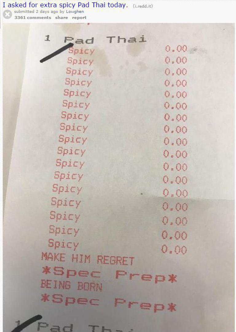 Gost jednog restorana u Velikoj Britaniji toliko je iznervirao konobara sa zahtjevima da želi začinjeniju hranu, da mu je ovaj odlučio dobro "zapapriti". Umjesto da na računu samo jednom napiše "ljuto", on je to napravio 17 puta. Na kraju narudžbe za kuhinju napisao je još i "napravite da je zažalio što se rodio". Račun je na reddit postavio korisnik Lowghen, koji je napisao - "danas sam zatražio ekstra ljuti pad thai".