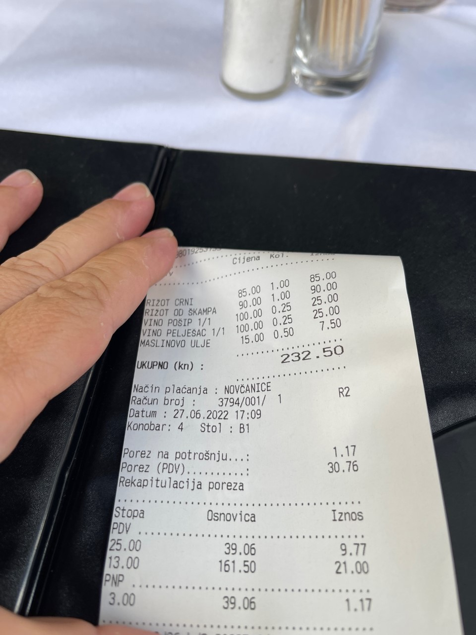 - Evo još jedan u nizu bisera Dalmacije. Ako kojim slučajem naručite maslinovo ulje za začinit ribu ili salatu... To vam se plaća od danas, 7,50 kn za par kapi ulja dodano na neukusni crni rižot. Jedite salatu i ribu bez ulja - poručio je čitatelj koji nam je poslao račun.
