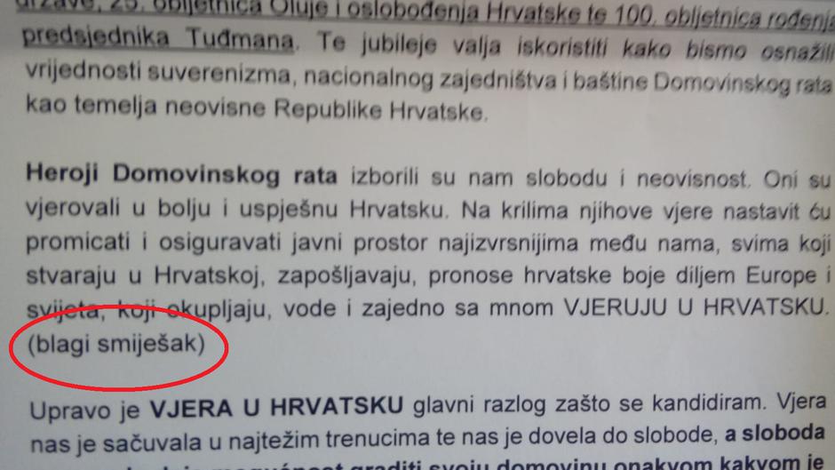 "Heroji Domovinskog rata izborili su nam slobodu i neovisnost. Oni su vjerovali u bolju i uspješnu Hrvatsku. Na krilima njihove vjere nastavit ću promicati i osiguravati javni prostor najizvrsnijima među nama, svima koji stvaraju u Hrvatskoj, zapošljavaju, pronose hrvatske boje diljem Europe i svijeta, koji okupljaju, vode i zajedno sa mnom VJERUJU U HRVATSKU. (blagi smiješak)".