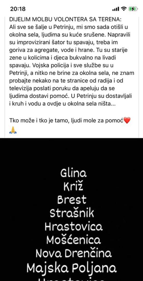 Preko društvenih mreža upućen je i apel za pomoć stanovnicima Gline i okolnih sela poput Križa, Bresta, Strašnika, Hrastovice u kojima su i dalje ljudi bez hrane, goriva za agregate te spavaju na livadama.