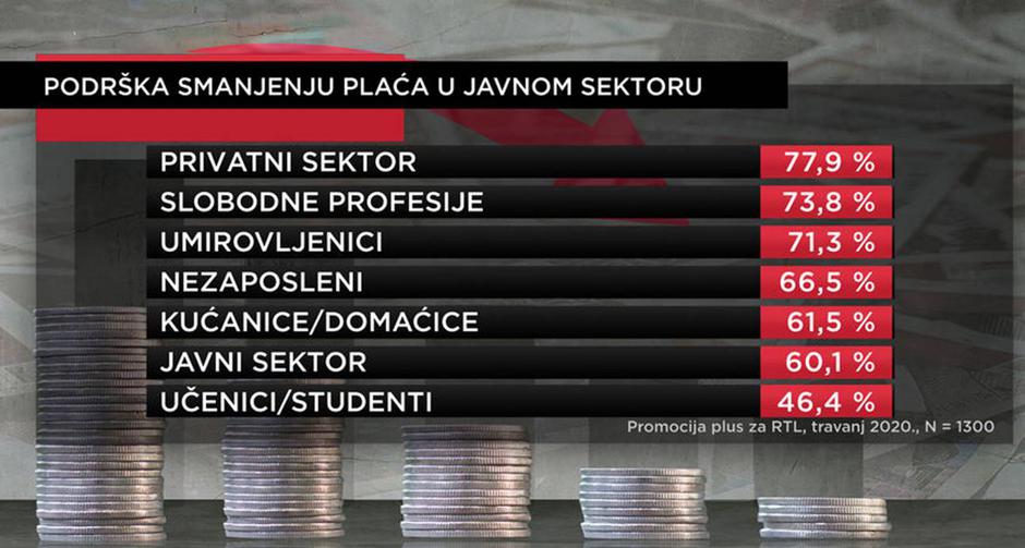 Podrška smanjenju plaća u dijelu javnog sektora očekivano je najveća u privatnom sektoru; gotovo 80 posto, slijede slobodne profesije i samozaposleni. Za tu je opciju više od 70 posto umirovljenika i 66,5 posto nezaposlenih.