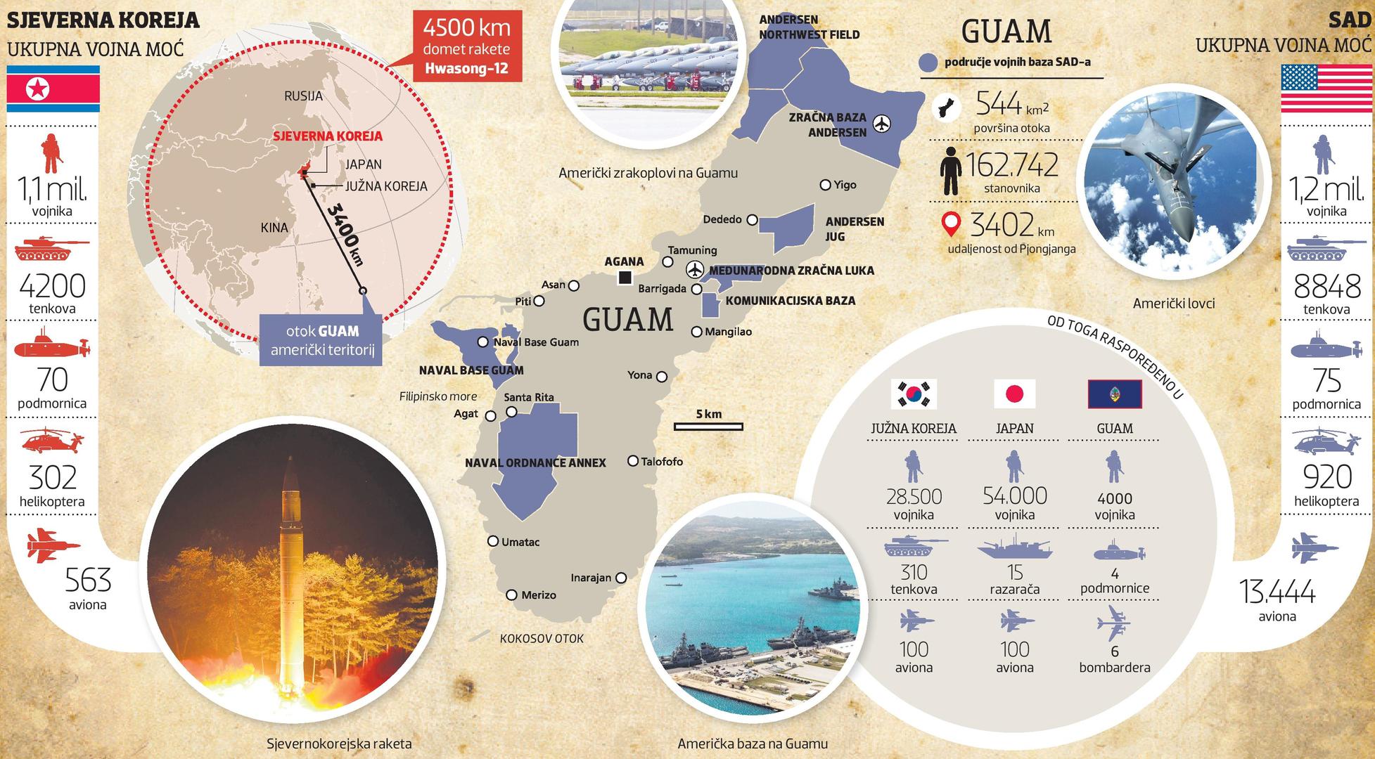 U ovome trenutku ovaj američki teritorij, turistička meka, ali i dom velike vojne baze američkog ratnog zrakoplovstva jedna je od rijetkih točaka oko koje bi mogao izbiti sukob velikih razmjera koji ne isključuje ni nuklearne udare. Upravo bi, prema najavama sjevernokorejske vojske, tridesetak kilometara od obala Guama uskoro trebale pasti četiri dalekometne rakete. Ako to odluči njihov lider Kim Jong-un.