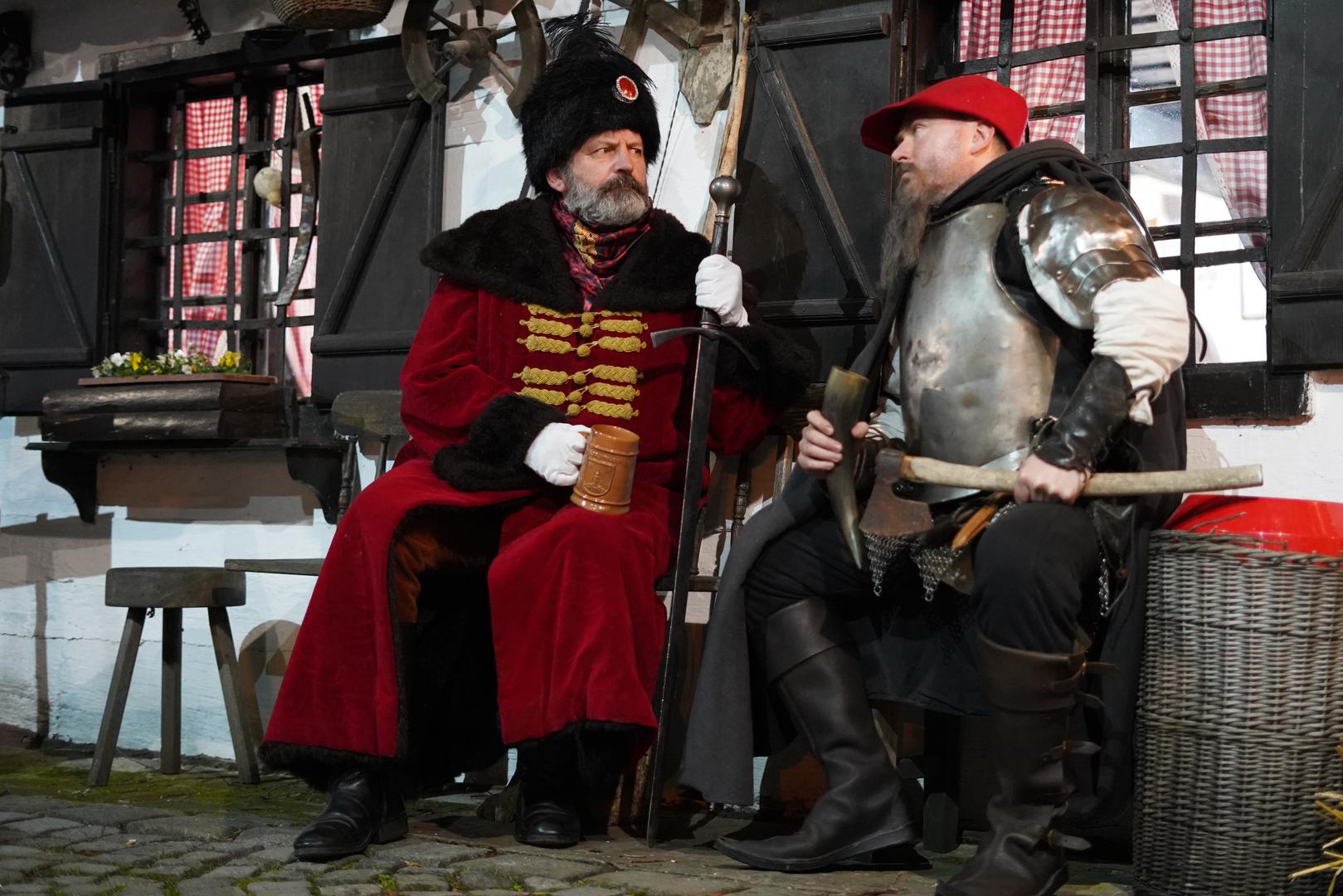 – Kradete nas! Bitku smo izgubili, ali ne i rat. Ne damo svoje kmetske žene koje nam ti i tvoja četiri sina otimate i vodite u dvorac! – veli Matija Gubec. – Ne, vi nas kradete! Pazite, oni se bune jer je porez samo desetina! Deset posto. A to što je danas dva i pola puta veći, 25 posto, to se nitko ne buni. A tad im je PDV od 10 posto bio puno! – kreće u priču Franjo Tahy. – Sučelili smo se nas dvojica još prije 452 godine, ali s mačem... Sučelit ćemo se i ove godine, pomirbe nema – veli Franjo Tahy.