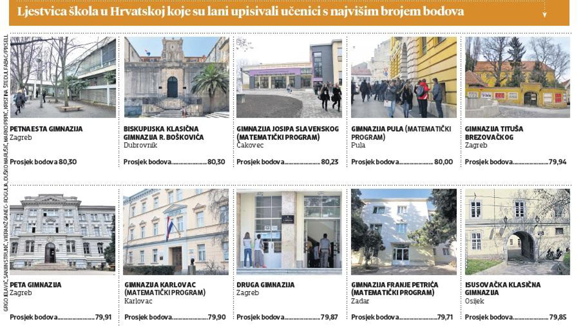 Zagrebačka Petnaesta gimnazija tradicionalno je na vrhu liste najatraktivnijih i lani su je upisivali učenici čiji je prosjek bodova na kraju iznosio 80,30, a isti broj bodova trebao je i za upis Biskupijsku klasičnu gimnaziju Ruđera Boškovića s pravom javnosti u Dubrovniku. Vrh bodovne ljestvice uglavnom drže prirodoslovno-matematički programi, kakav je, primjerice, i Gimnaziju Josipa Slavenskog iz Čakovca s 80,23 boda pozicionirao na treće mjesto. No, ako se u ponekim gimnazijama koje izvode više programa, primjerice kombinaciju prirodoslovno-matematičkog i općeg, gleda ukupan prosjek, pozicije se donekle mijenjaju, ali činjenicu da učenici s najboljim ocjenama odlaze u matematičke gimnazije potvrđuju i ovogodišnje prijave učenika.
