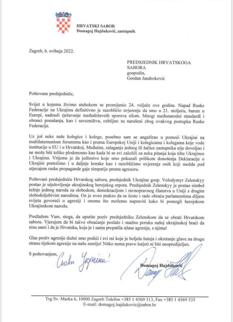 Saborski zastupnik Domagoj Hajduković uputio je dopis predsjedniku Hrvatskog sabora Gordanu Jandrokoviću u kojem predlaže da se pozove ukrajinski predsjednik Volodimir Zelenski da se obrati Saboru.