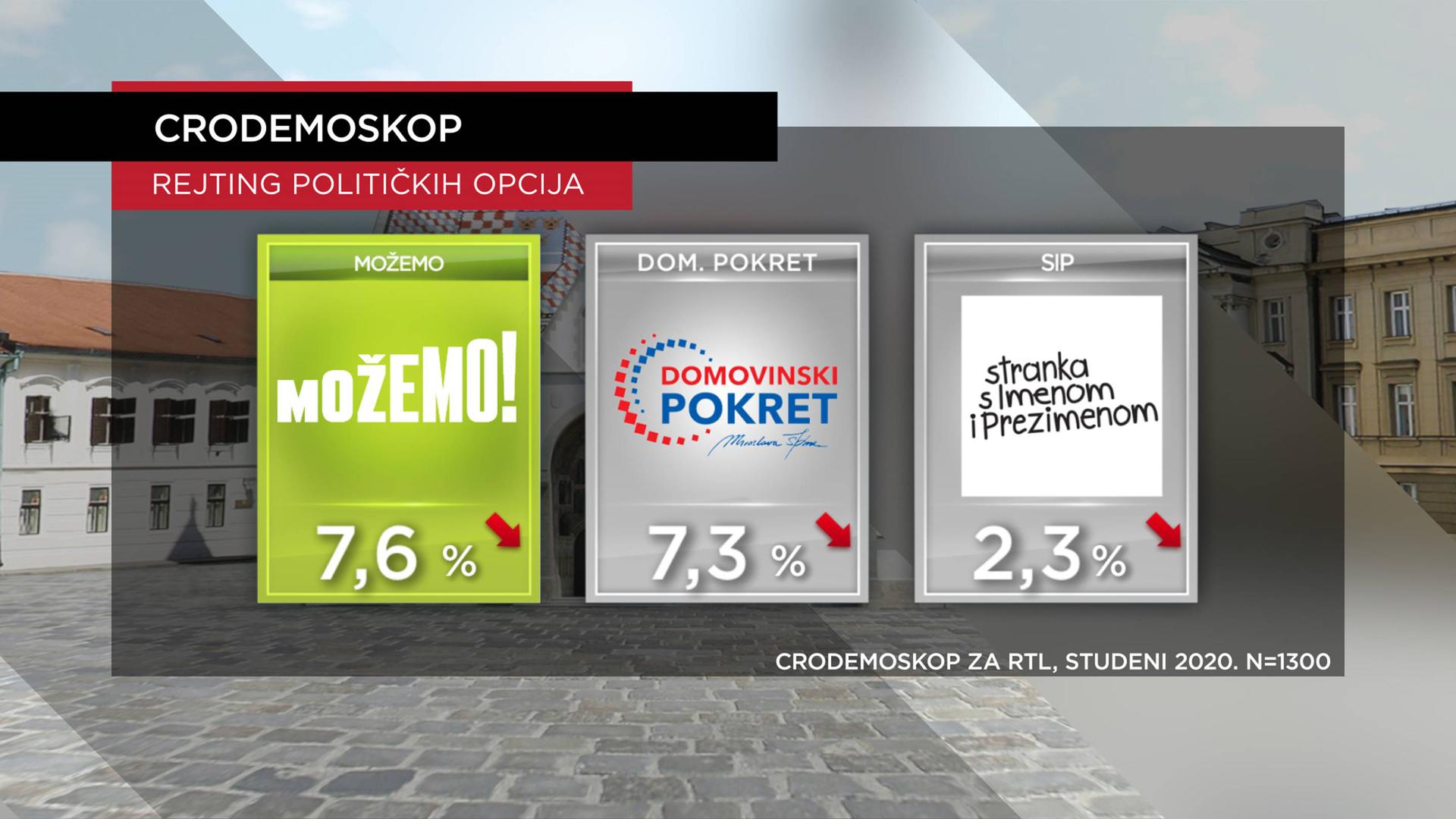 Blizu je platforma Možemo! (7,6 posto), ali uz pad rejtinga koji je vidljiv i kod Domovinskog pokreta (7,3 posto). Sve ostale stranke i opcije su daleko. Stranka s imenom i prezimenom ima 2,3 posto...