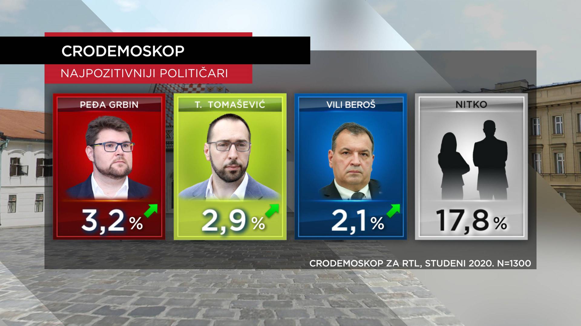 Slijedi novi predsjednik SDP-a Peđa Grbin (3,2 posto), pa čelnik platforme Možemo! Tomislav Tomašević (2,9 posto), tek nakon njih ministar zdravstva Vili Beroš (2,1 posto). 'Nitko' (17,8 posto) ostaje najpopularniji za gotovo 18 posto građana.