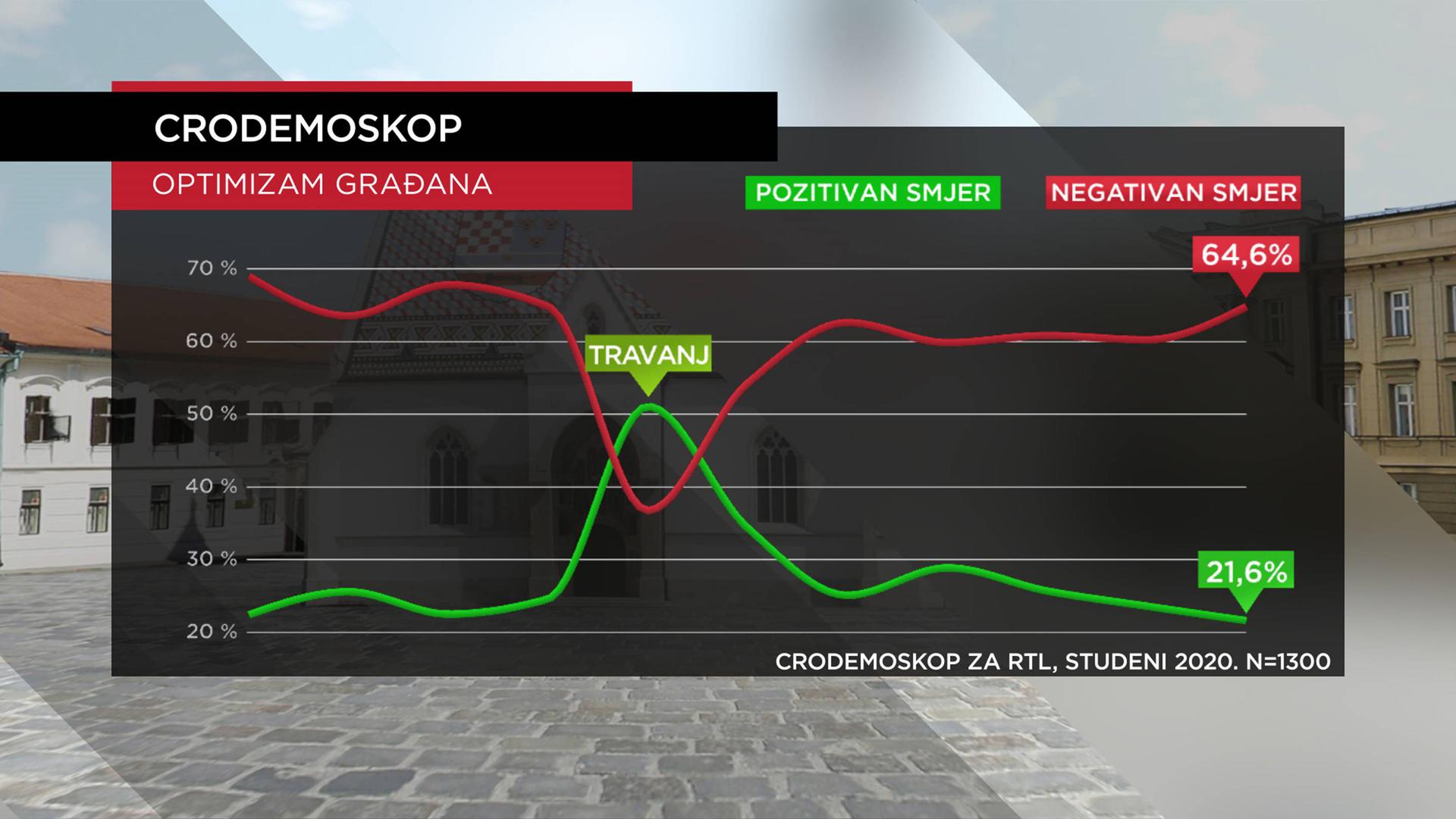 U travnju, na vrhuncu prvog vala koronavirusa optimizam je bio rekordan, to je ovdje i vidljivo, a sada na vrhuncu drugog vala 64,6 posto građana misli da idemo u lošem smjeru. Ima i optimističnih - 21,6 posto. Da je smjer pogrešan najčešći je stav SDP-ovih birača dok optimizam dominira u odgovorima birača HDZ-a.