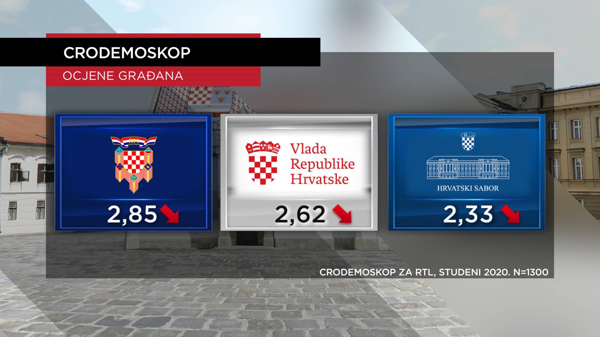 Blagi pad u odnosu na listopad bilježe ocjene rada i Ureda predsjednika (2,85) i Vlade (2,62) i Sabora (2,33) ali prosječne ocjene su iste: dvije trojke i dvojka za Sabor.