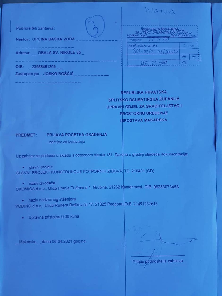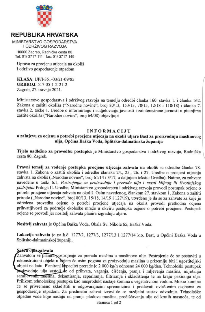 Dana 6. travnja 2021. Roščić Upravnom odjelu za graditeljstvo i prostorno uređenje s ispostavom u Makarskoj prijavljuje početak građenja potpornog zida, iako u naravi počinje gradnju dvoetažne uljare s neto površinom od oko 1000 četvornih metara. Da je riječ o grubim manipulacijama i pravnim spletkama, dokazuje i dokument koji također posjedujemo. Naime, Općina je Ministarstvu gospodarstva i prostornog uređenja podnijela zahtjev za ocjenu o potrebi procjene utjecaja na okoliš uljare Bast. Riječ je o postupku koji treba biti ocijenjen pozitivno da bi se uopće moglo krenuti s ikakvim radovima.