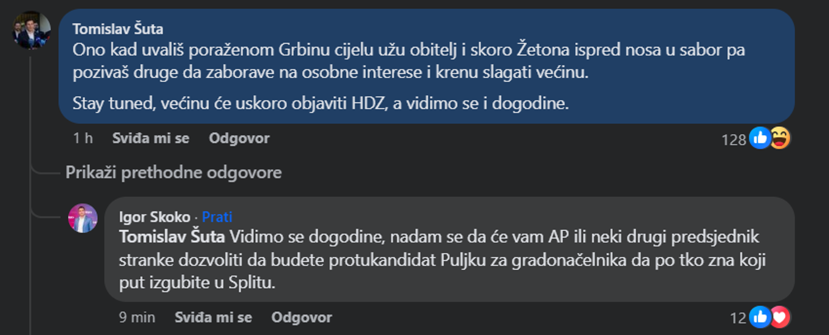 "Ono kad uvališ poraženom Grbinu cijelu užu obitelj i skoro Žetona ispred nosa u sabor pa pozivaš druge da zaborave na osobne interese i krenu slagati većinu. Stay tuned, većinu će uskoro objaviti HDZ, a vidimo se i dogodine", naveo je Šuta.