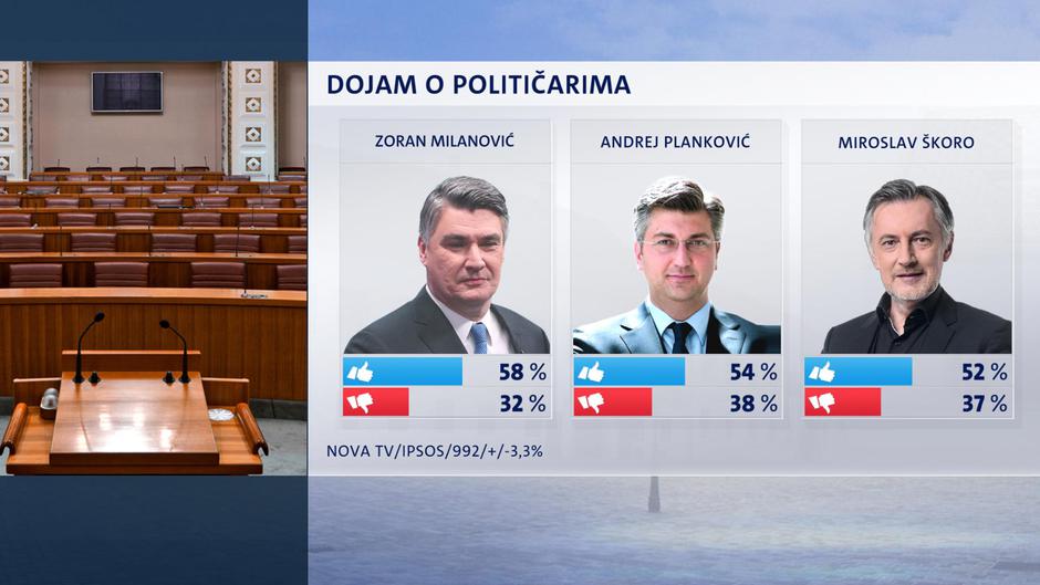 Predsjednik države Zoran Milanović i dalje je najpopularniji političar u zemlji. O njemu pozitivan dojam ima 58 posto ispitanika, a njih 32 posto ima negativan dojam. Na drugom je mjestu premijer Andrej Plenković o kojemu pozitivan dojam ima 54 posto ispitanika što je rast u odnosu na ranije mjesece.