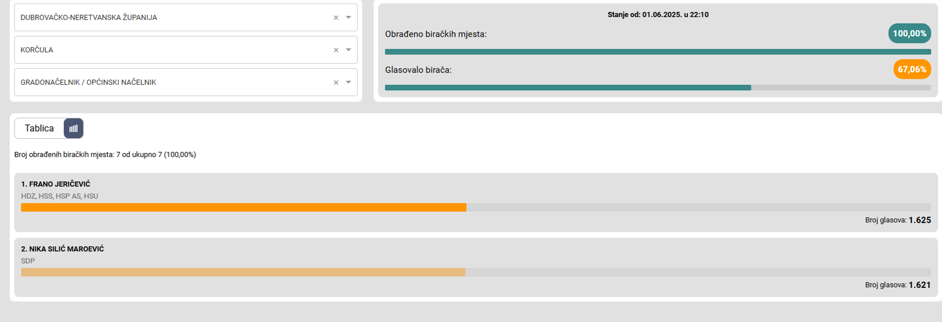 Izlaznost u drugom krugu izbora na Korčuli bila je veća nego što je to bio slučaj u prvome. Pritom je HDZ-ov Frano Jeričević postao novi gradonačelnik grada sa samo četiri glasa više od bivše gradonačelnice Nike Silić Maroević (SDP).