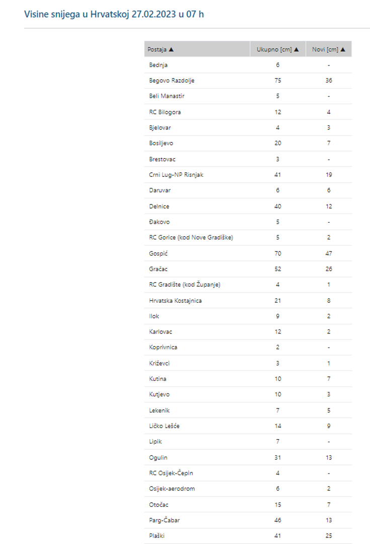 DHMZ objavio je visinu snijega jutros u 7 sati. Najviše ga je na Zavižanu, čak 91 cm, dok Begovo Razdolje mjeri 75 cm. Iza njih su Gospić sa 70 cm i Plitvička jezera sa 68 cm. Podsjetimo, za putnike koji su zbog zimskih uvjeta zapeli u prometu, organizirano je nekoliko prihvatnih centara: GRAČAC, Nikole Tesle 37 (kod mosta u Gračacu). Svi ugostiteljski objekti, benzinske pumpe i trgovine bit će otvoreni tijekom noći; OBROVAC, Ivane Brlić Mažuranić 4 (kontakt osoba Dražen Breulj, 098 973 1350); GOSPIĆ, Miroslava Kraljevića 19 (prostor Gradske sportske dvorane); KNIN, u prostorijama Studentskog doma.