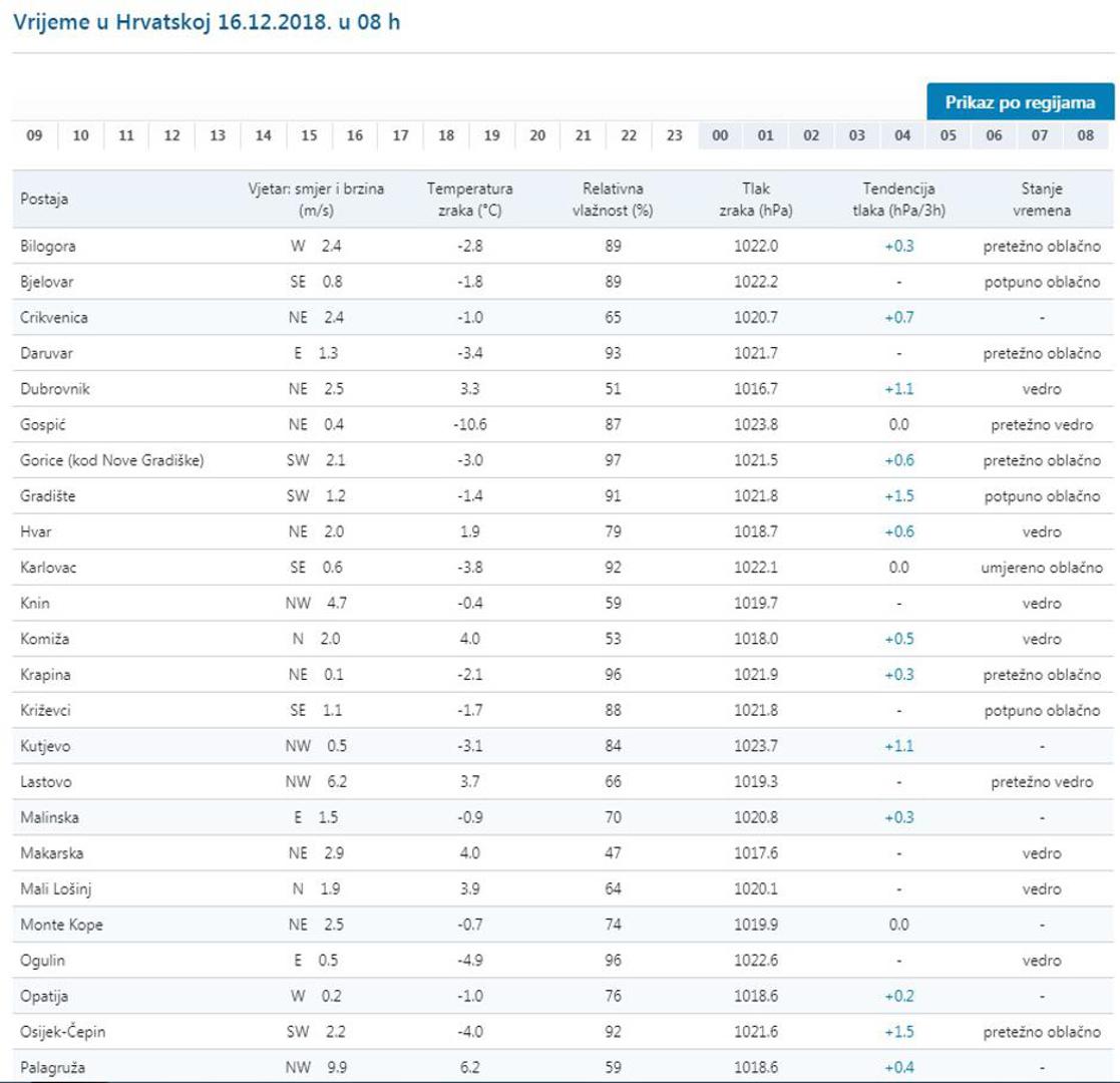 Posebno hladno jutro bilo je u središnjoj i gorskoj Hrvatskoj gdje su se temperature spustile i do minus 10. U Gospiću je u 8 ujutro izmjereno -10,6 stupnjeva, u Ogulinu -4,9, Pazinu -7,2. Opatija se "probudila" na -1, a Hvar, koji ima najviše sunčanih dana u godini, jutro je dočekao na niskih 1.9 stupnjeva.
