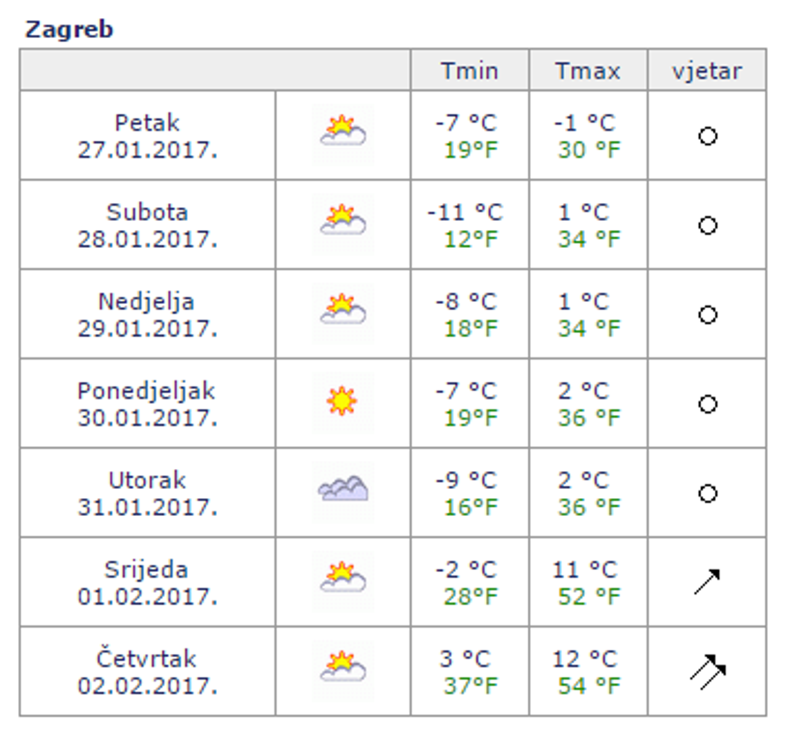 Kako piše DHMZ, Zagreb će dočekati hladna subota od čak -11, ali već u ponedjeljak sunčano će vrijeme donijet porast temperature, te će se konačno ugrijati na 12 stupnjeva u četvrtak.
