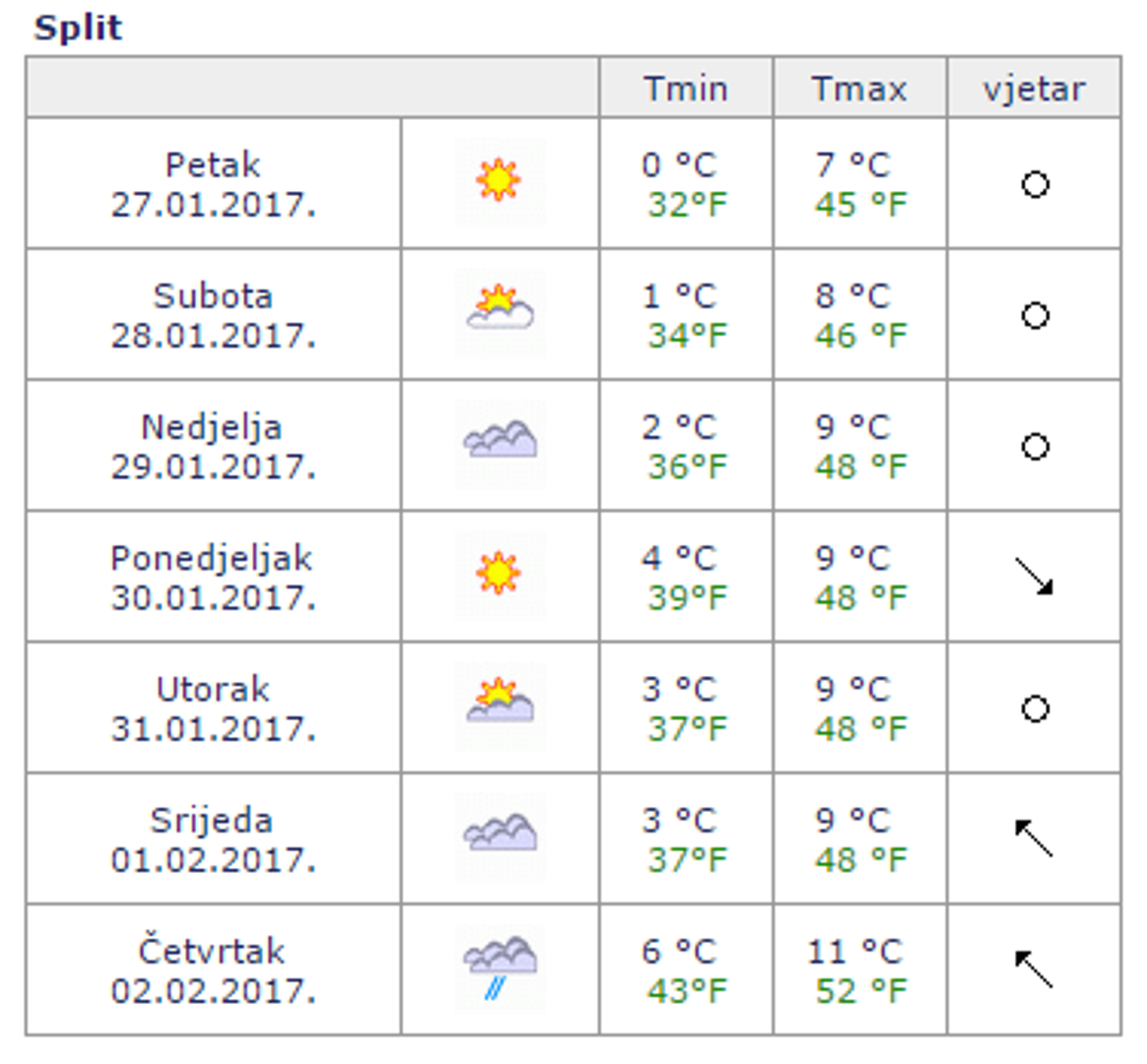 Toplije i bez velikih minusa očekuje i jug zemlje, pa će tako Split uz sunčani ponedjeljak i 9 stupnjeva dočekati i kišu uz 11 stupnjeva i jugoistočni vjetar.