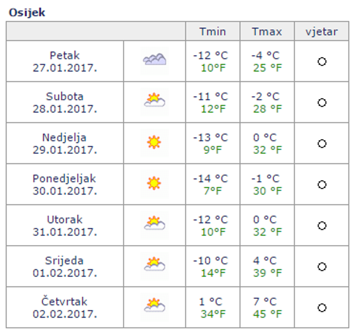 Iako će se još nekoliko dana niske temperature zadržati u kopnenom dijelu Hrvatske, pa će se tako Osijek u ponedjeljak probuditi na ledenih -14 Celzijevih, Hrvatsku napokon očekuje porast temperature.