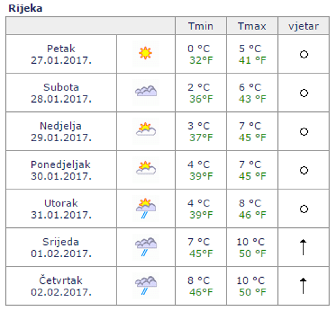 U Rijeci se temperature neće spuštati ispod ništice, a najviših 10 stupnjeva bit će popraćeni južnim vjetrom.