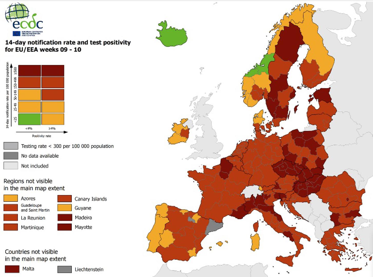 Grafički prikaz država prema bojama sukladno riziku od bolesti COVID-19 moguće je naći na web stranicama Europskog centra za sprečavanje i kontrolu bolesti (ECDC).