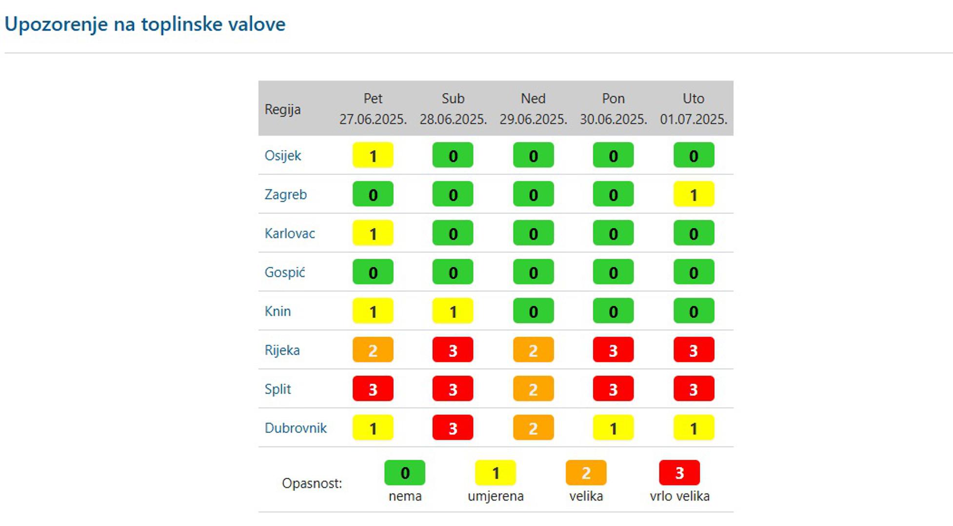 Pretežno sunčano i vruće, na Jadranu i vrlo vruće nastavlja se i u nedjelju. U unutrašnjosti povremeno uz umjerenu naoblaku. Vjetar slab, u nedjelju i umjeren sjeveroistočni i sjeverni. Na Jadranu će puhati umjerena bura, još u nedjelju i jaka, na sjevernom dijelu na udare i olujna, a sredinom dana okretat će na slab do umjeren sjeverozapadnjak i jugozapadnjak. Temperatura zraka na kopnu u porastu, javlja DHMZ koji je objavio i upozorenja za toplinske valove.