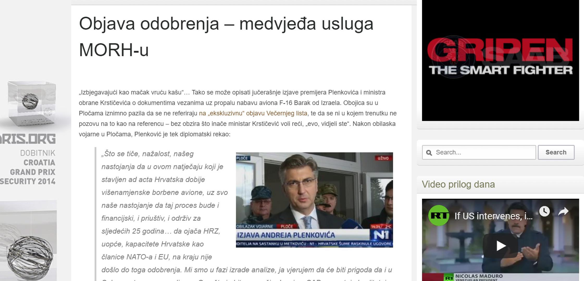 Tabak, koji ovih dana ne silazi s ekrana TV kuća, predstavljen je kao nezavisni stručnjak, no činjenica je da uz tekstove koje objavljuje Obris.org stoji reklama švedskog SAAB-a, proizvođača JAS-39 Gripena “THE SMART FIGHTERA”. Proizvođač s te reklame, naime, ljutit je protivnik svih ponuditelja F-16 na svim svjetskim natječajima.