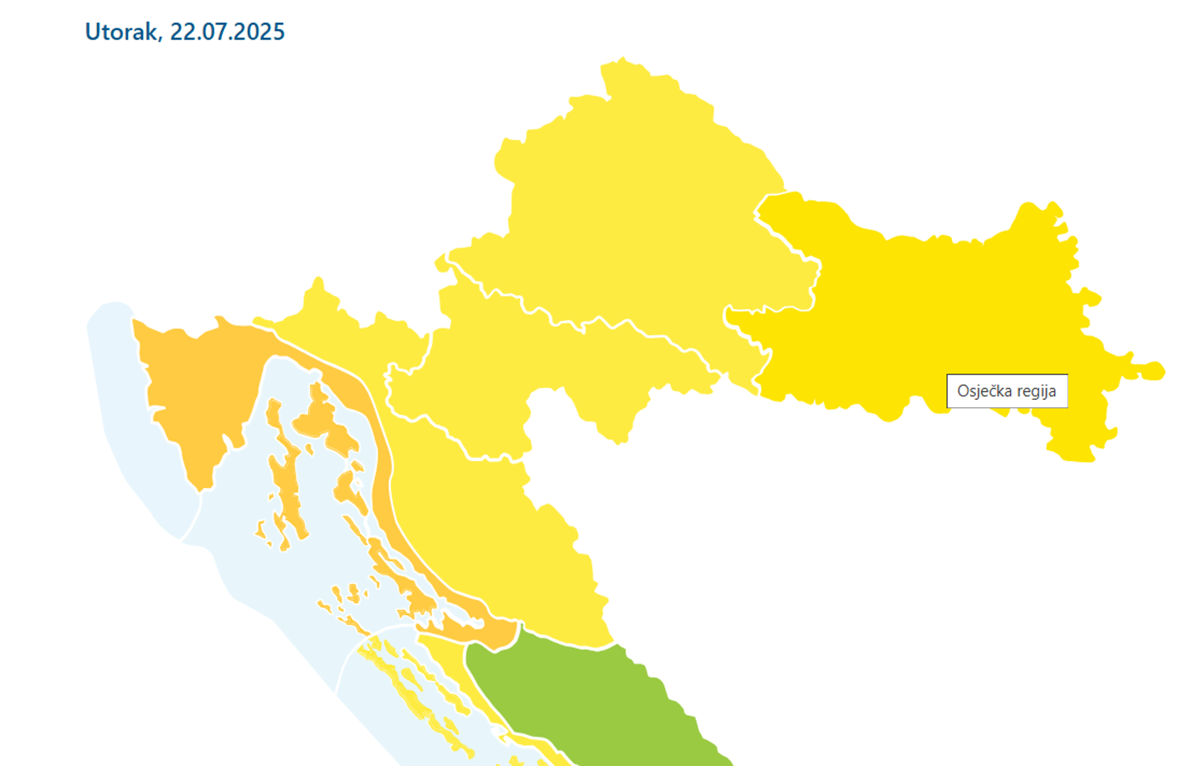Kako je objavio DHMZ u Dalmaciji će danas biti pretežno sunčano i vruće vrijeme. U ostalim krajevima promjenljivo oblačno i nestabilno, mjestimice uz kišu ili pljuskove s grmljavinom, lokalno moguće izraženije. Poslijepodne smanjenje naoblake. Vjetar na kopnu većinom slab, na Jadranu slabo do umjereno jugo, od sredine dana jugozapadni i sjeverozapadni vjetar. Najviša dnevna temperatura od 25 do 30, na Jadranu između 29 i 34 °C. Za gotovo cijelu Hrvatsku, osim krajnjeg juga za danas je izdan meteoalarm zbog mogućih izraženijih pljuskova s grmljavinom.