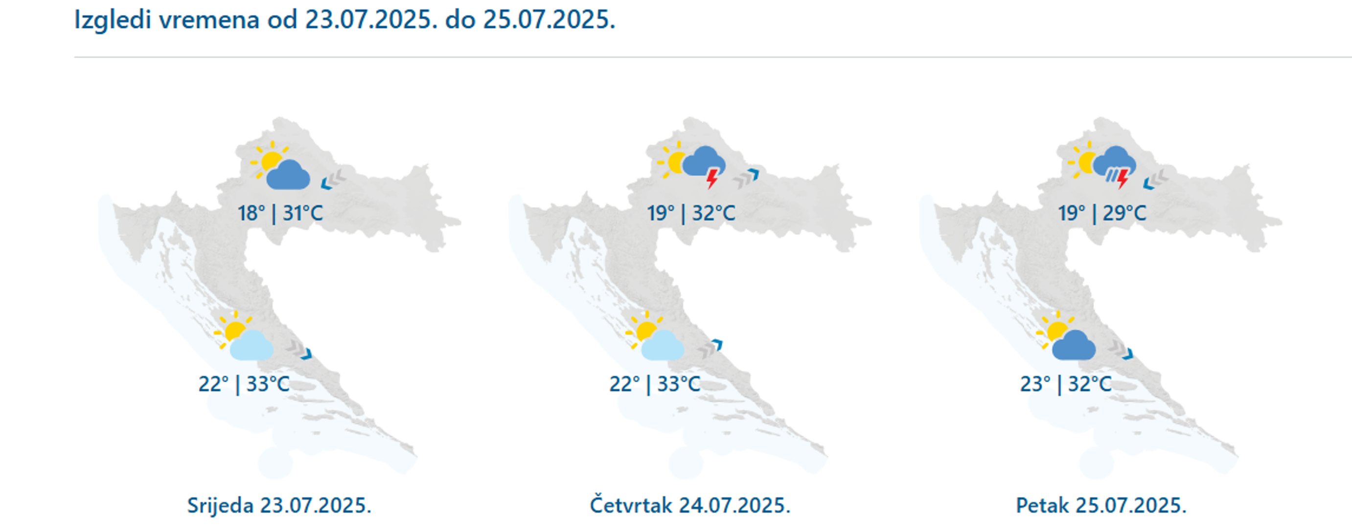 U srijedu će biti pretežno sunčano, a poslijepodne je u unutrašnjosti uz dnevni razvoj oblaka moguć poneki pljusak, javlja DHMZ. U četvrtak djelomice, u Dalmaciji i pretežno sunčano. Uz mjestimičnu promjenljivu naoblaku moguća je kiša ili lokalni pljuskovi s grmljavinom, osobito na sjevernom Jadranu te uz granicu sa Slovenijom, a u petak promjenljivije i nestabilnije uz češće pljuskove i grmljavinu. Vjetar slab, ponegdje do umjeren sjeveroistočni i istočni, u četvrtak će okrenuti na jugozapadni, a u petak uz jače nestabilnost vjetar prolazno može biti i jak. Na Jadranu će puhati sjeverozapadni i zapadni vjetar, u četvrtak prolazno jugozapadni i jugo. Na Jadranu temperatura bez već promjene, a na kopnu u srijedu i četvrtak danju toplije, a u petak će temperatura ponovno malo pasti.