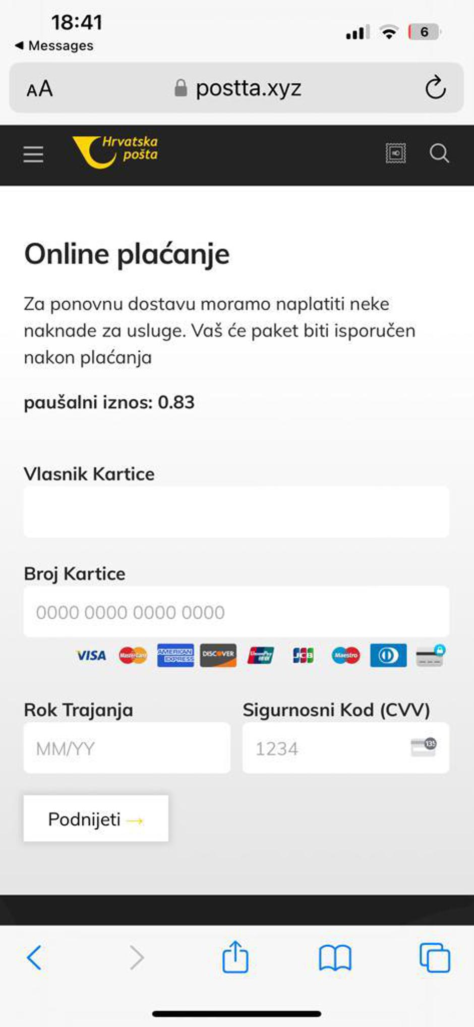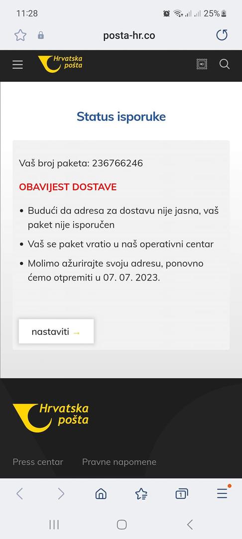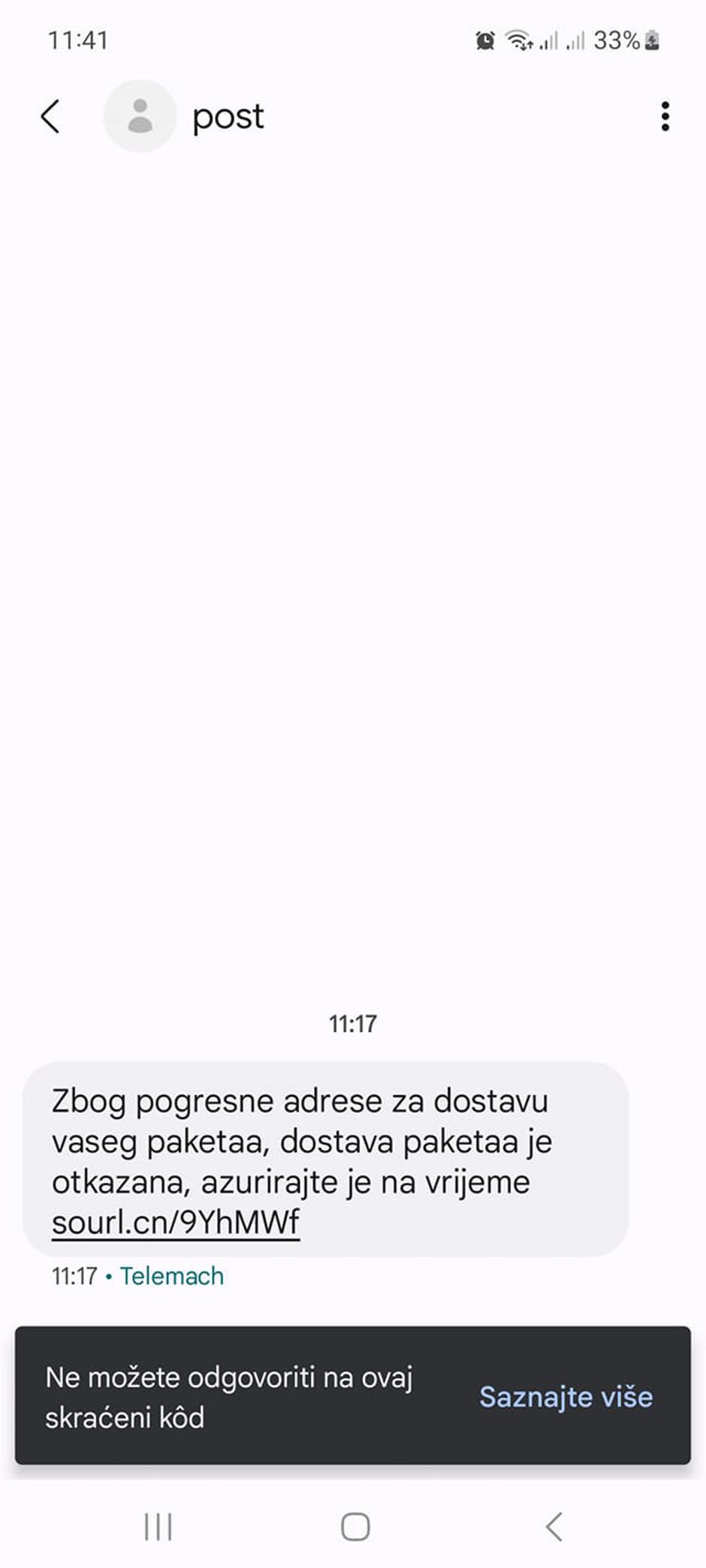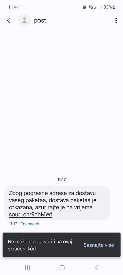 Putem SMS poruka šire se lažne obavijesti s poveznicom u kojima se od korisnika traži uplata iznosa za isporuku pošiljke. Nemojte odgovarati na takve poruke ni otvarati poveznice koje se u njima nalaze jer se time izlažete riziku od krađe svojih podataka.