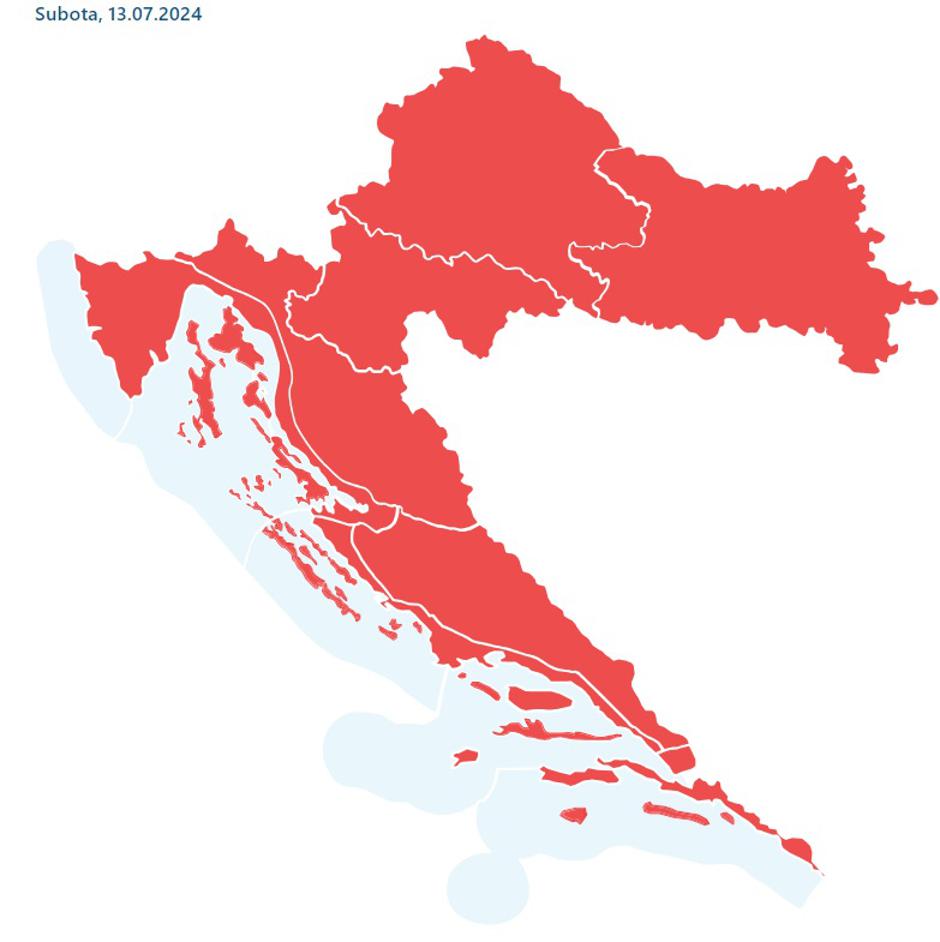 Pretežno sunčano i većinom vrlo vruće. U unutrašnjosti i Istri moguć je pljusak s grmljavinom, popodne na sjeveru i izraženiji. Vjetar slab do umjeren jugozapadni, na sjeveru i sjeveroistočni, na moru mjestimice južni i jugoistočni. Najviša temperatura većinom od 33 do 38 °C, najavljuje Državni hidrometeorološki zavod za ovu subotu, dok je Hrvatska već četvrti dan pod crvenim meteoalarmom zbog vrućina. Vrućine se najavljuju i za iduće dane, no ipak se za nedjelju očekuje slabije popuštanje.
