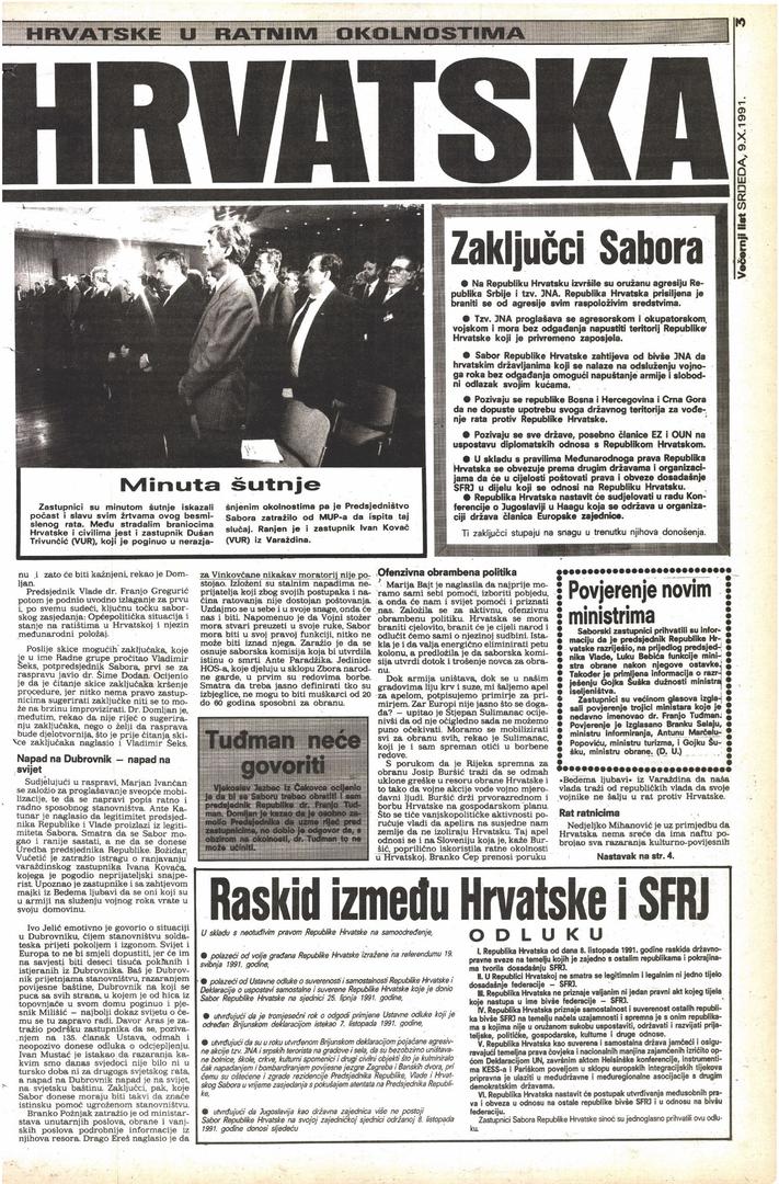 Hrvatski sabor u subotu obilježava svoj Dan, u spomen na 8. listopada 1991. kada je donio povijesnu odluku o raskidu svih državnopravnih veza s bivšom SFRJ, čime je Hrvatska postala neovisna država. Povijesnu odluku Sabor je donio dan nakon što je istekao tromjesečni moratorij na odluku o samostalnosti Hrvatske od 25. lipnja, i nakon što su dan prije zrakoplovi JNA raketirali Banske dvore, tadašnje sjedište Vlade i prvog predsjednika Franje Tuđmana.