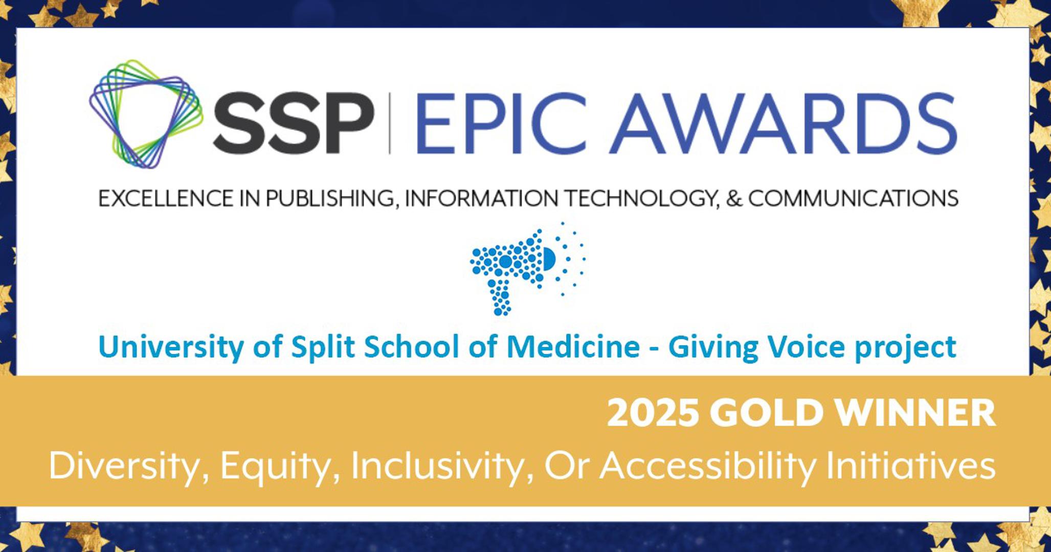 Medicinski fakultet Sveučilišta u Splitu dobio je izuzetno priznanje. Društvo za znanstveno izdavaštvo, Society for Scholarly Publishing, dodijelilo je ovoj ustanovi Zlatnu medalju u kategoriji Inicijativa za raznolikost, jednakost, uključivost i pristupačnost za projekt Giving Voice, kojim se pomaže ukrajinskim znanstvenicima u objavljivanju radova o posljedicama rata u njihovoj zemlji.