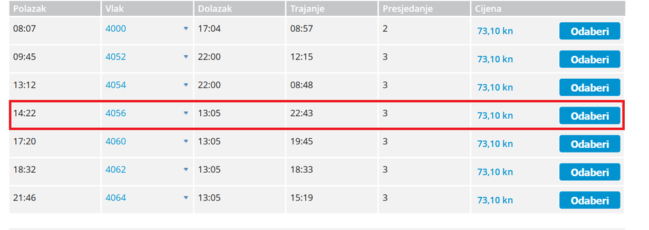 Vožnju za jednog putnika u jednom smjeru platit ćete 73, 10 kuna. Isto košta i najduža vožnja od Zagreba do Pule, a koja traje 22 sata i 43 minute. Taj vlak kreće u 14:22, a nakon tri predsjedanja stići ćete u Pulu sljedećeg dana u 13:05, pod uvjetom da nema kašnjenja.