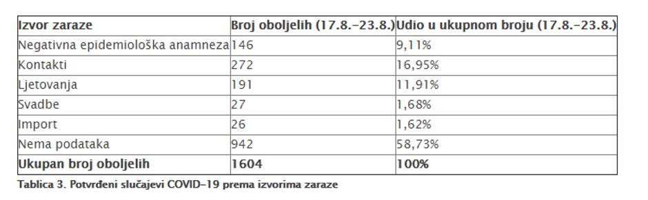Kako navode, u razdoblju od 17.8. do 24.8. sve županije zabilježile su novoboljele slučajeve bolesti COVID-19. Najviše novooboljelih bilježi Splitsko-dalmatinska županija, a slijede je Grad Zagreb te Šibensko-kninska i Zadarska županija koje imaju jednak broj novooboljelih u posljednjih tjedan dana.