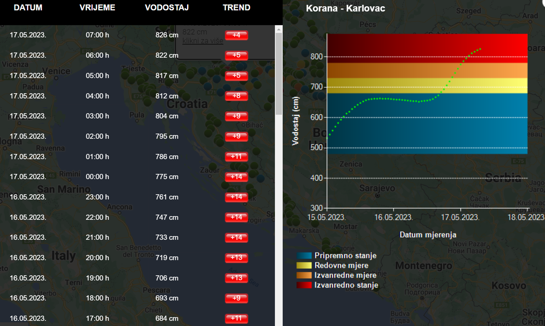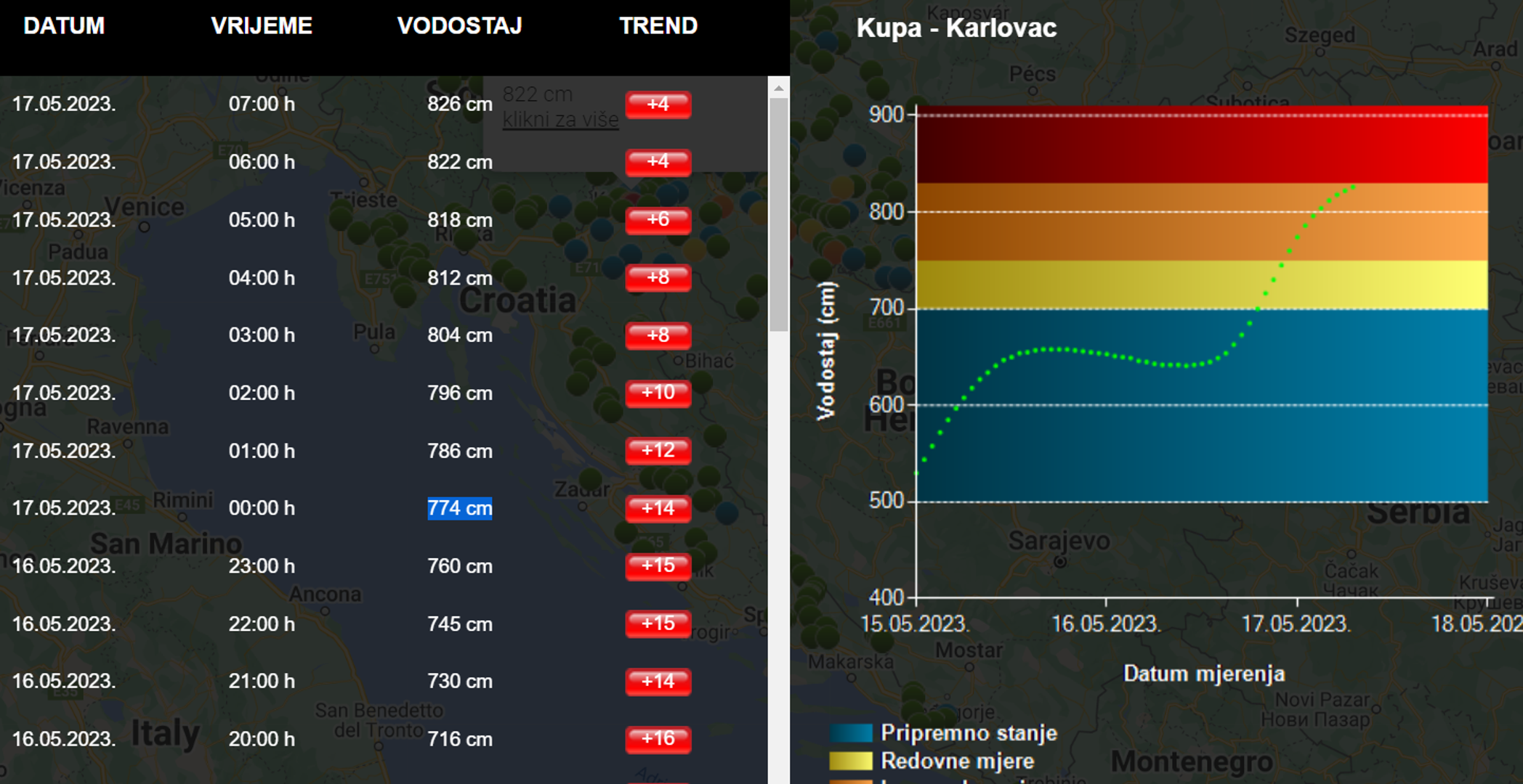 Trenutni vodostaj rijeke Kupe u Karlovcu 17.5.2023. u 9:00 sati iznosi +831 cm, čime je dosegnuta razina za uvođenje izvanrednog stanja i za rijeku Kupu u Karlovcu.