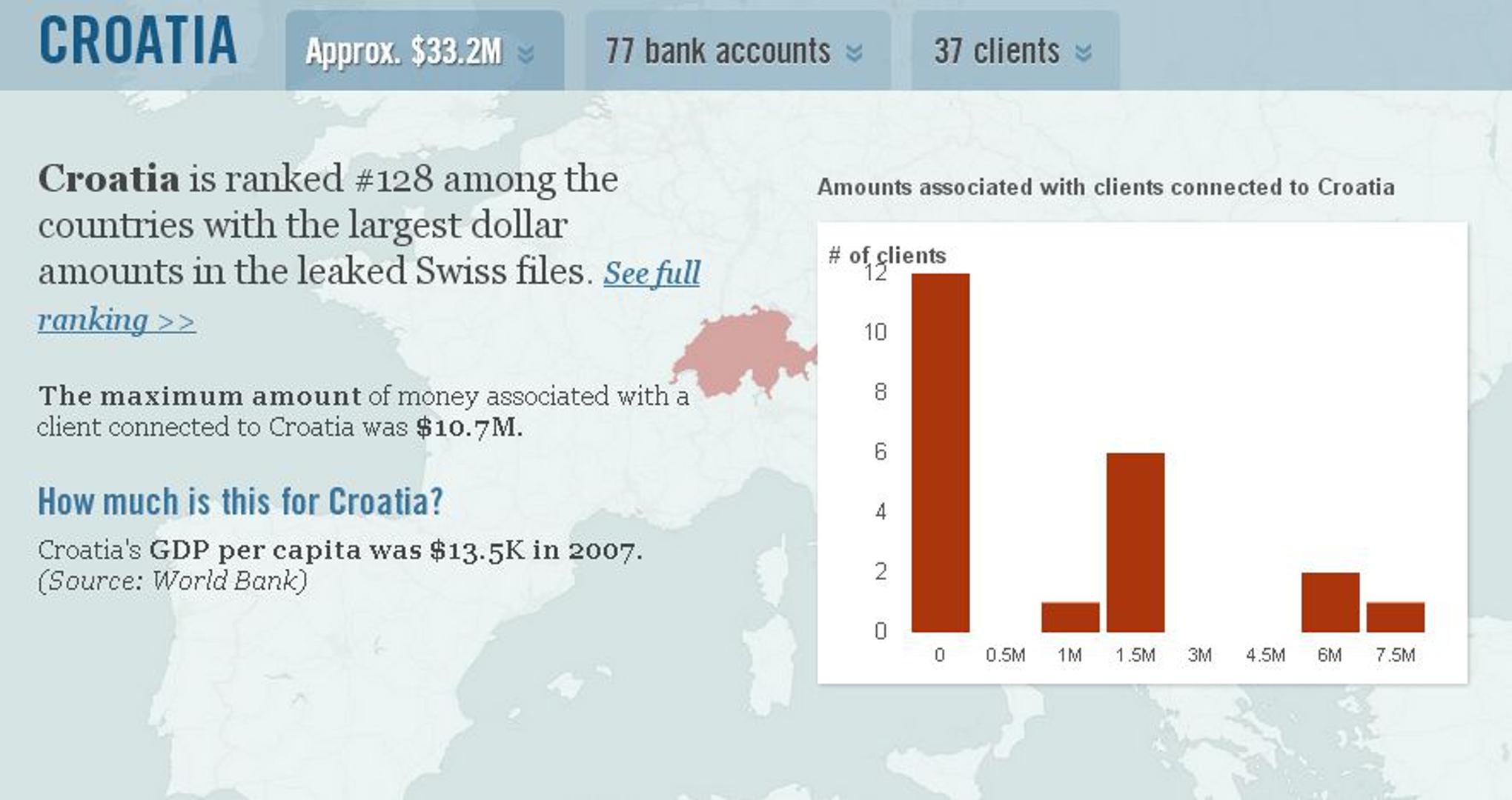 Među više od 200 zemalja čiji su državljani poslovali sa švicarskom podružnicom banke HSBC koja ih je savjetovala kako izbjeći poreze te isplaćivala neoznačene novčanice, našla se i Hrvatska.